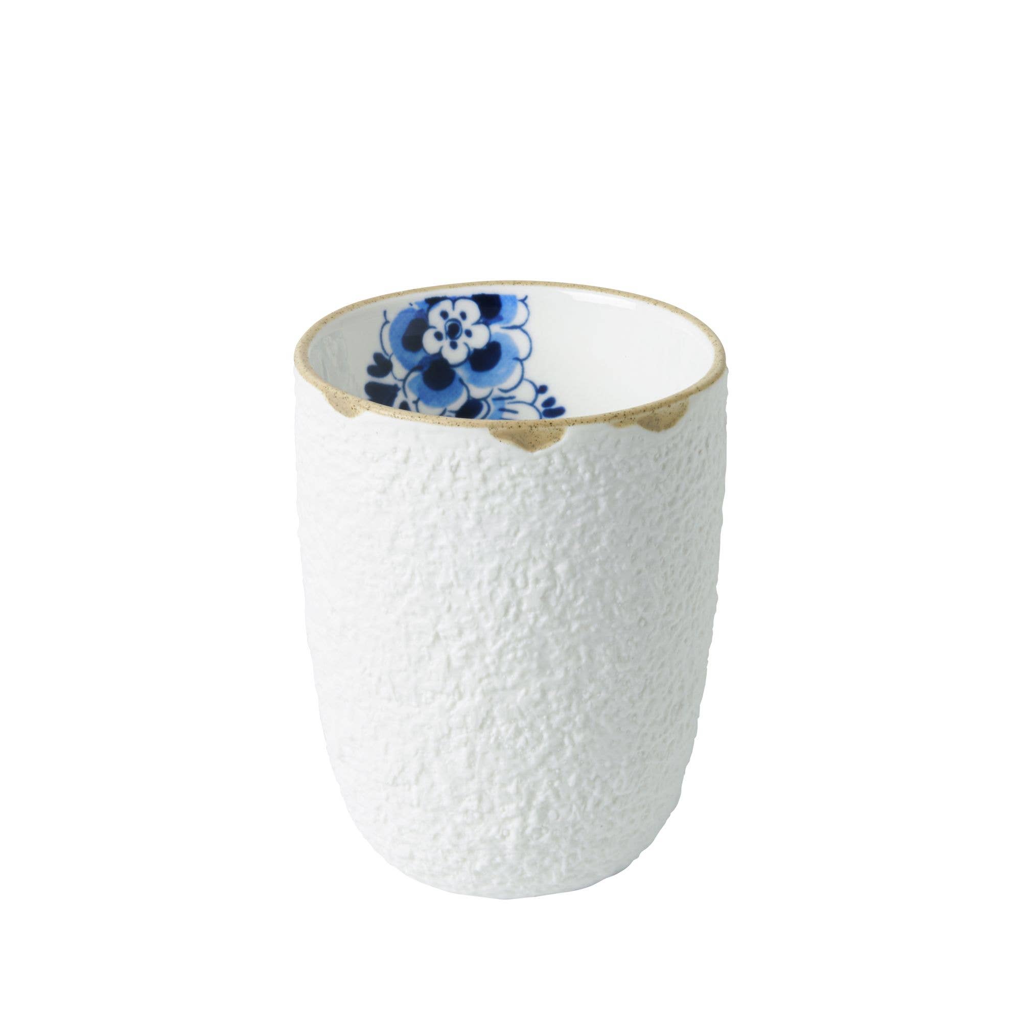 Die Blue Blossom Kollektion ist an ihrem charakteristischen Rand erkennbar, der an alte Keramik erinnert. Da dieser Rand von Hand geformt wird, können Farb- und Strukturabweichungen auftreten. Dieses schöne Ergebnis spiegelt die Anmut alter Handwerkskunst wider: ein feiner Porzellanbecher mit Henkel aus der Blue Blossom Serie. Die Designerin Debbie Wijskamp sieht viel Schönheit im Vergänglichen und Unvollkommenen. Mit dem Blue Blossom Geschirr bietet sie den Beweis dafür. Die Kollektion zeichnet sich durch klassische, runde Formen und weiche Linien aus, die die Strukturen und die Delfter Blaudekoration hervorheben. "Normalerweise zeigt Delfter Blaudesign große Motive, aber ich wollte kleine Elemente herausgreifen und auf einer Seite des Geschirrs platzieren. Die Dekoration scheint aus dem Rand herauszukriechen, was dem Geschirr ein ruhiges Erscheinungsbild verleiht."