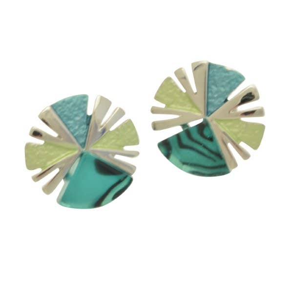 Ein zeitgenössisches Design mit handbemalten zweifarbigen violetten Scherben, die um einen indigofarbenen Reifen herabfallen. Der Anhänger misst 4,5 cm in der Höhe und 3,2 cm in der Breite und hängt an einer 41 cm langen Schlangenkette mit 8 cm Verlängerung.