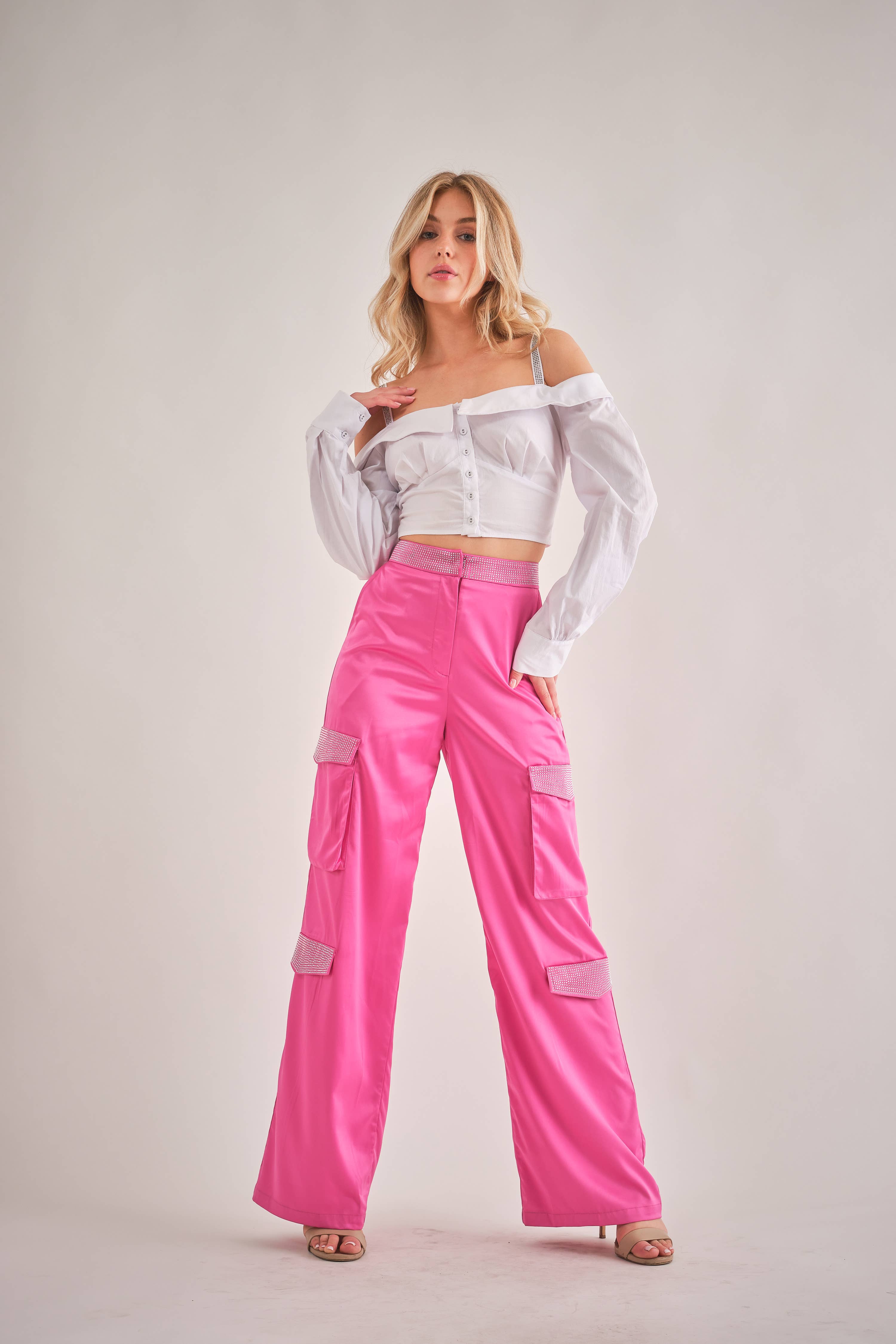 Damenbekleidung Metallische Cargo-Hose Dehnbarer metallischer Stoff Hohe Taille Mit Strasssteinen verzierte Cargo-Taschen und Bund Gerade Passform Produkt-ID: IP2890