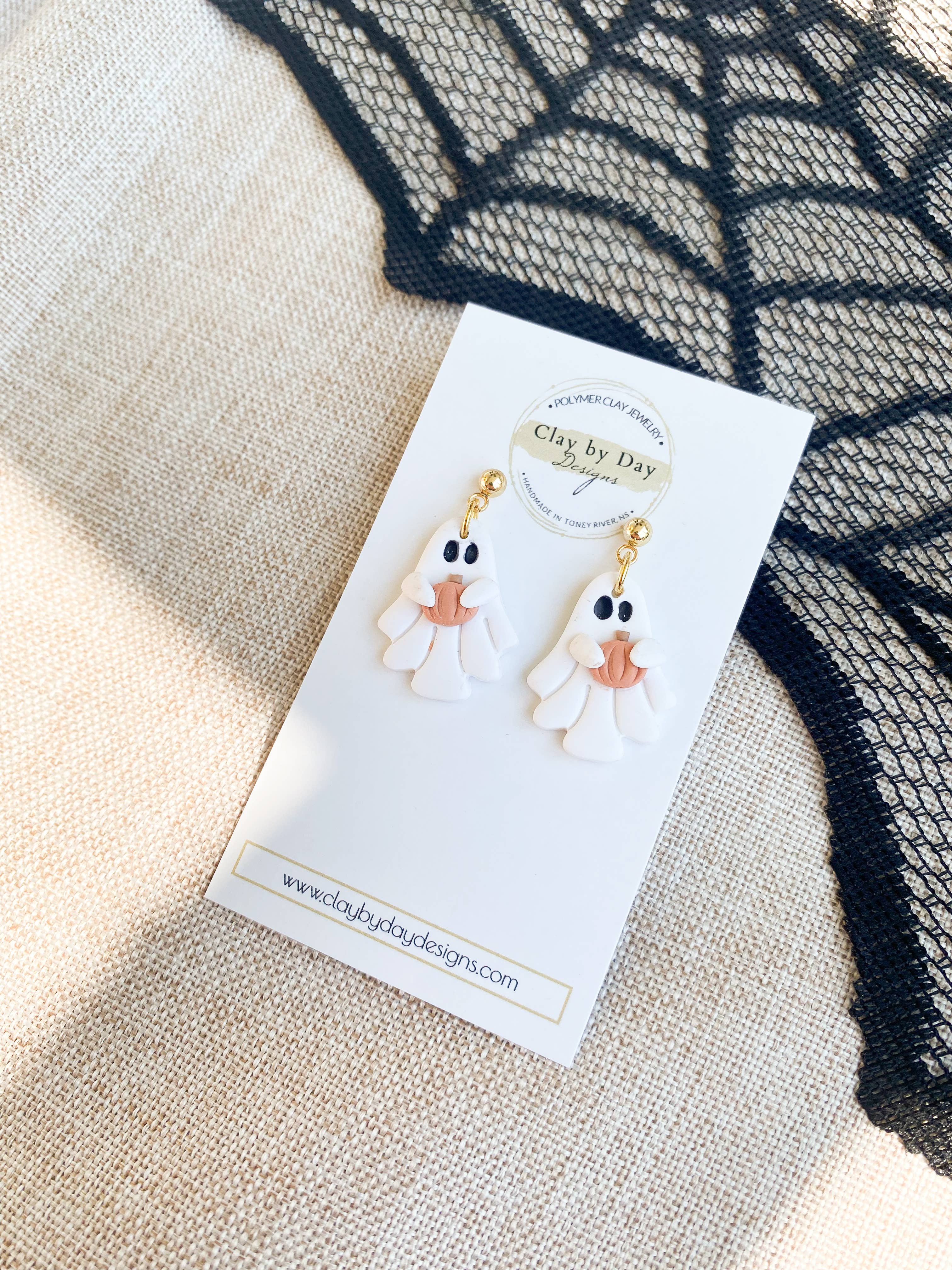 Ohrring „Gespenst mit Kürbis“ aus Fimo, im Dangle-Stil.