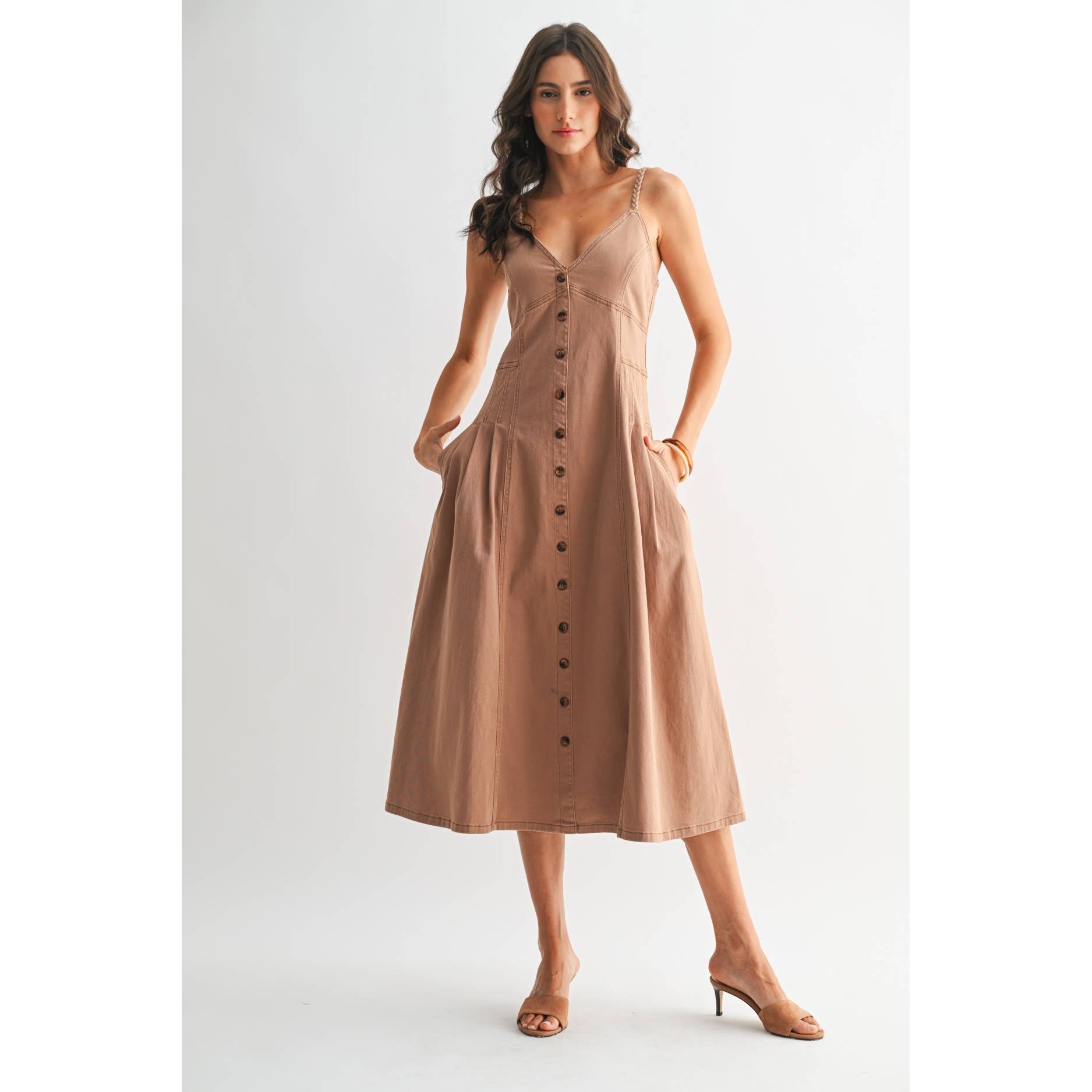 Schulterfreies Design: Verleiht einen Hauch von boho-chicer Eleganz, perfekt, um sonnengeküsste Schultern zu zeigen. Gesmoktes Oberteil: Bietet eine schmeichelhafte Passform, betont Ihre natürliche Form und sorgt für Komfort. Fließender Rock: Die Midi-Länge und der leichte Stoff sorgen für eine anmutige, luftige Bewegung. Verstellbarer Taillenbund: Ermöglicht Anpassungen für die perfekte Passform und Stil. SELBST: 85% VISKOSE 15% LEINEN FUTTER: 100% BAUMWOLLE Das Model trägt Größe S Model: 5'8" - B 32" - T 24" - H 35,5"