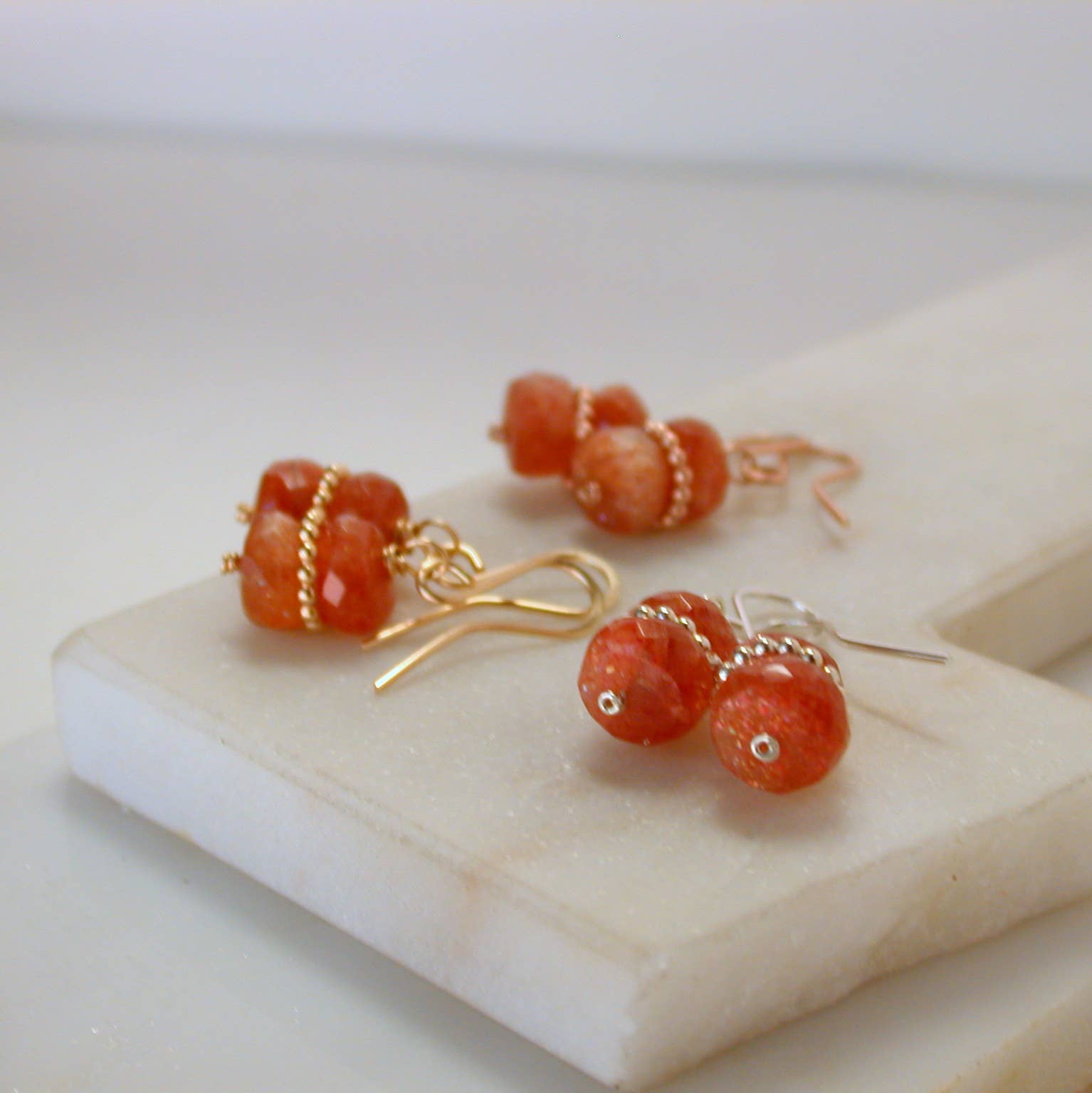 Eine Auswahl an Steinen. 14k Goldfüllung. Rhodochrosit, Sonnenstein und rosa Turmalin. Ohrringe messen 1,5" von oben nach unten. Der Reifen misst 1". Einzeln kaufen oder $3 beim Kauf des kompletten Sets sparen. Sterlingsilber in separater Auflistung.