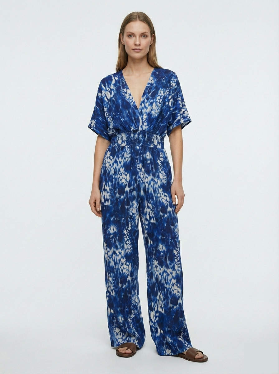 Gemusterte Hose mit Batik-Effekt, elastischem Bund und Bindegürtel. One-Size-Passform, geeignet für die Größen 36 bis 42. 100 % Viskose.