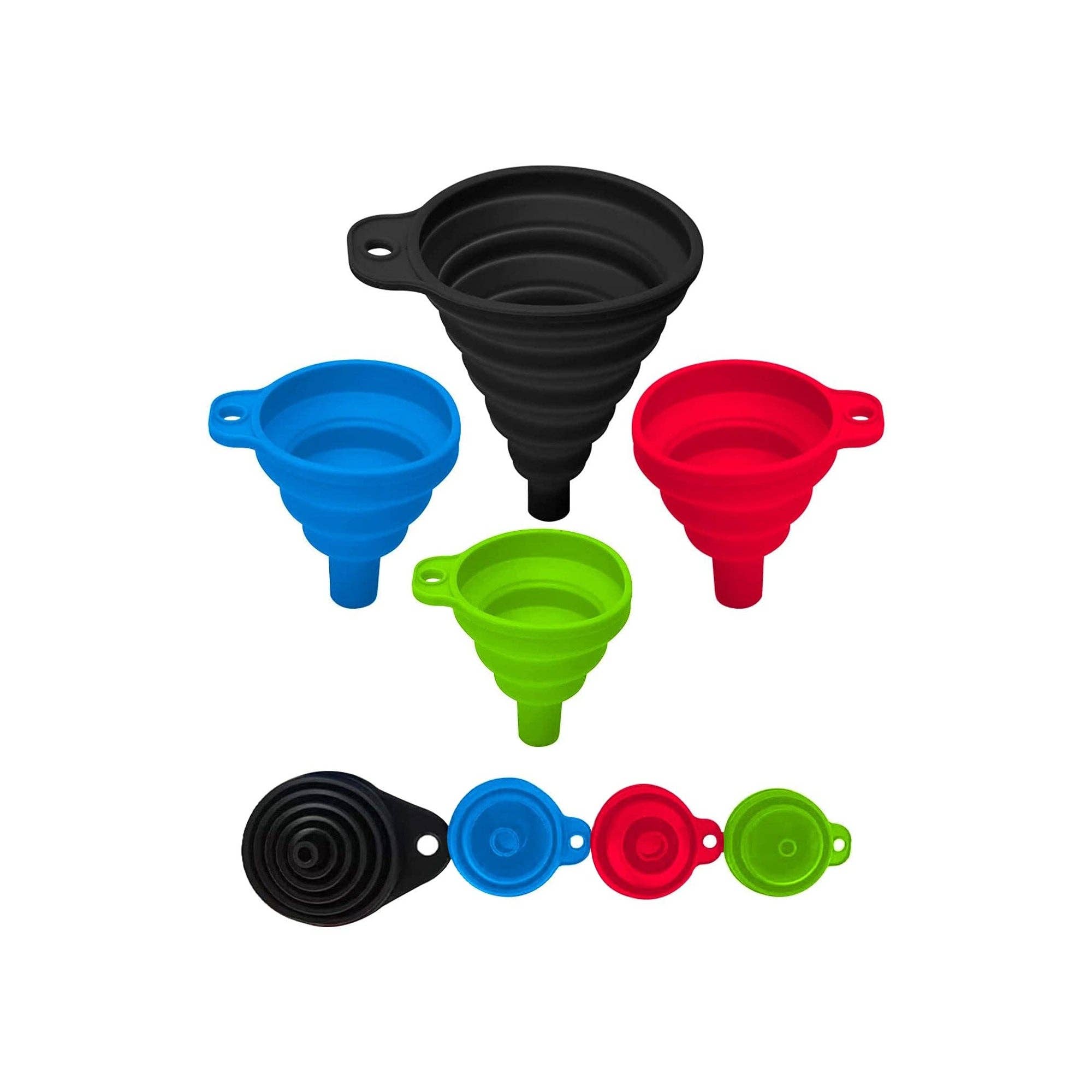 Satz von 4 zusammenklappbaren Silikon-Küchentrichtern - von sehr klein bis groß für einfachen Flüssigkeitstransfer, lebensmittelechte zusammenklappbare Silikonutensilien (Sortimentspackung) im Großhandel