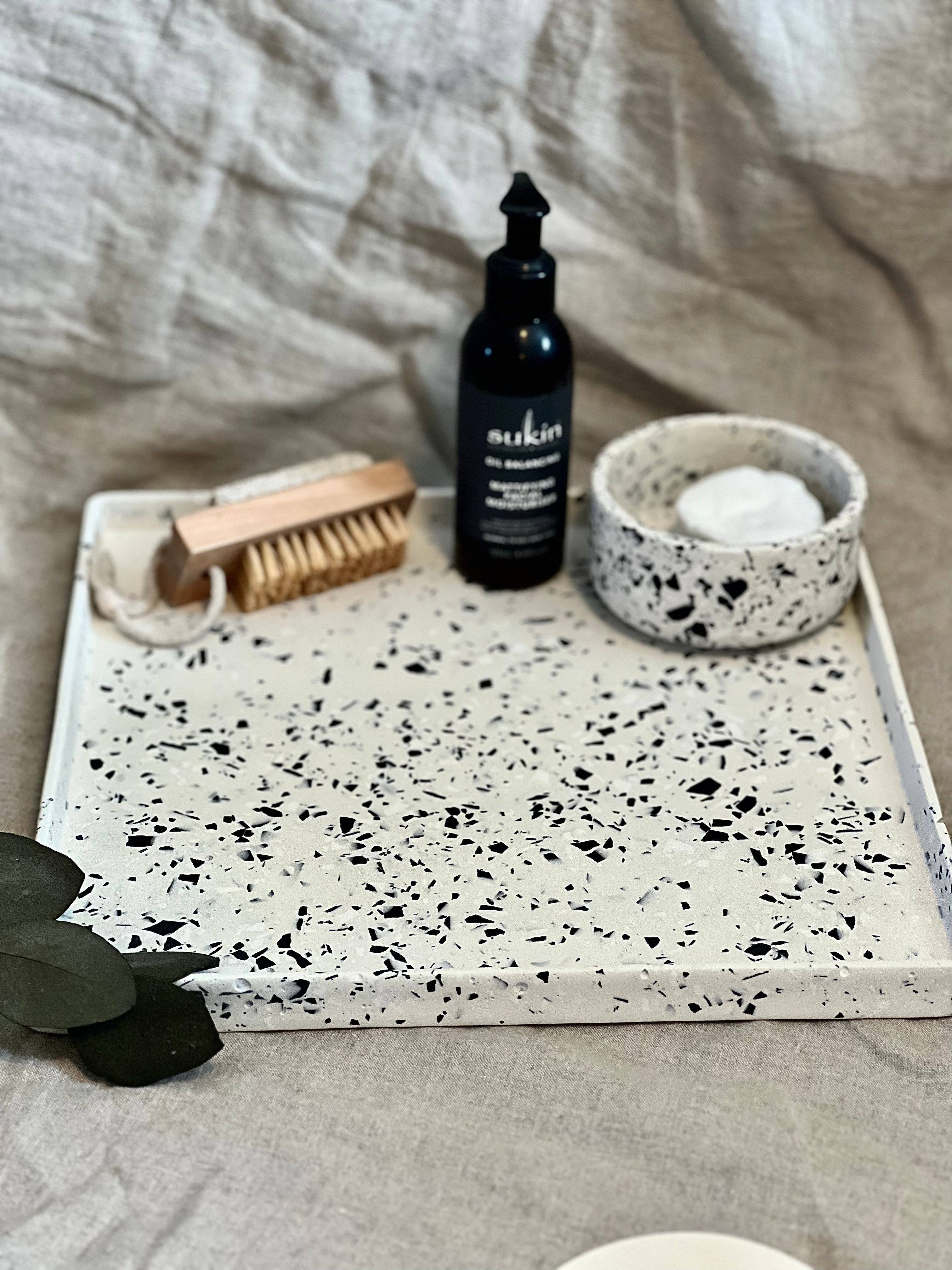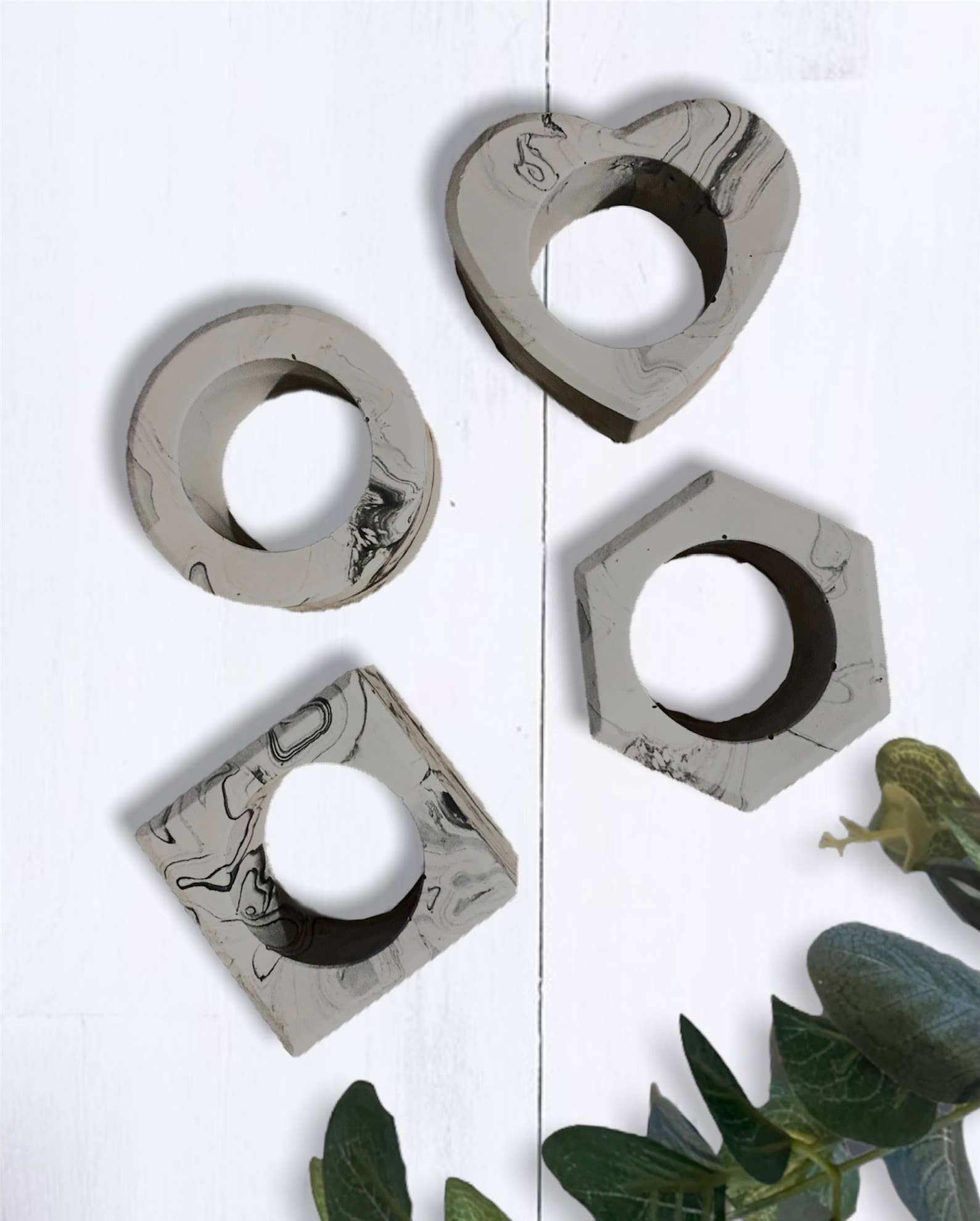 Set mit 4 Jesmonit-Serviettenringen Graue Farbe marmoriert mit Holzkohle, schwarz und weiß, um die Wirkung von Beton zu erzielen Versiegelt mit 100% natürlicher Kokosnuss und Sojawachs