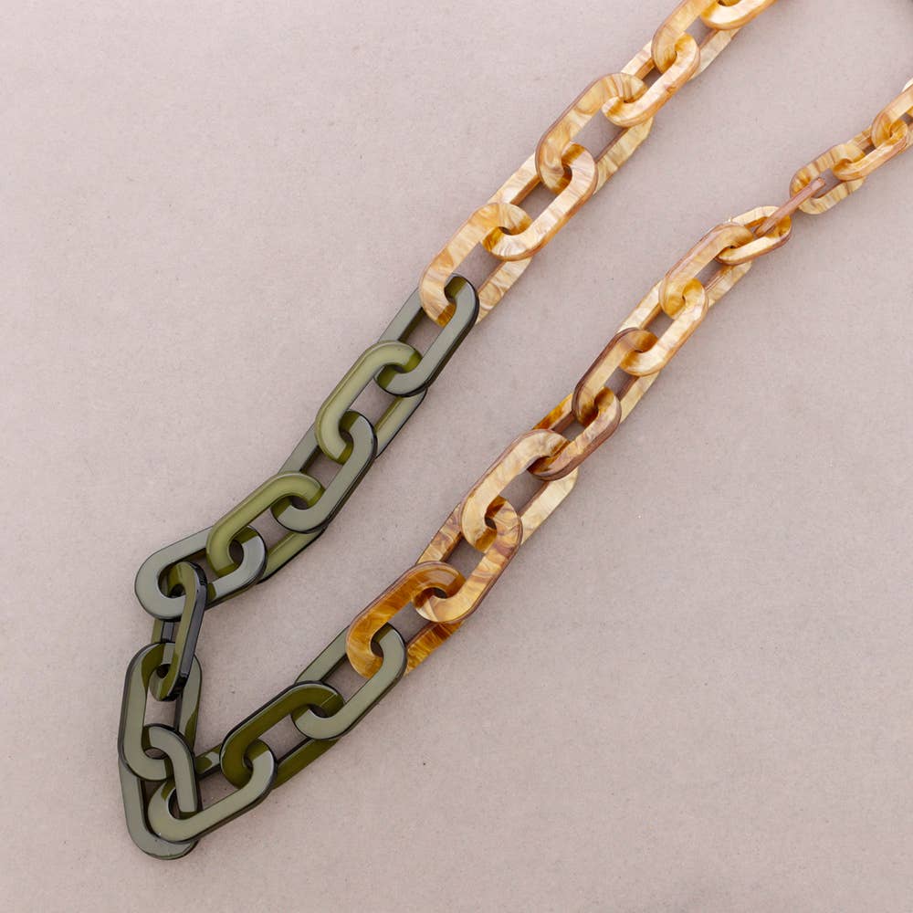 Halskette aus Edelstahl mit breiten Gliedern. Material: Edelstahl mit einer Titannitrid-Beschichtung von 0,3–0,5 µm und 0,95 µm Gold. Frei von Nickel und Blei, was der Kette eine lange Haltbarkeit verleiht.