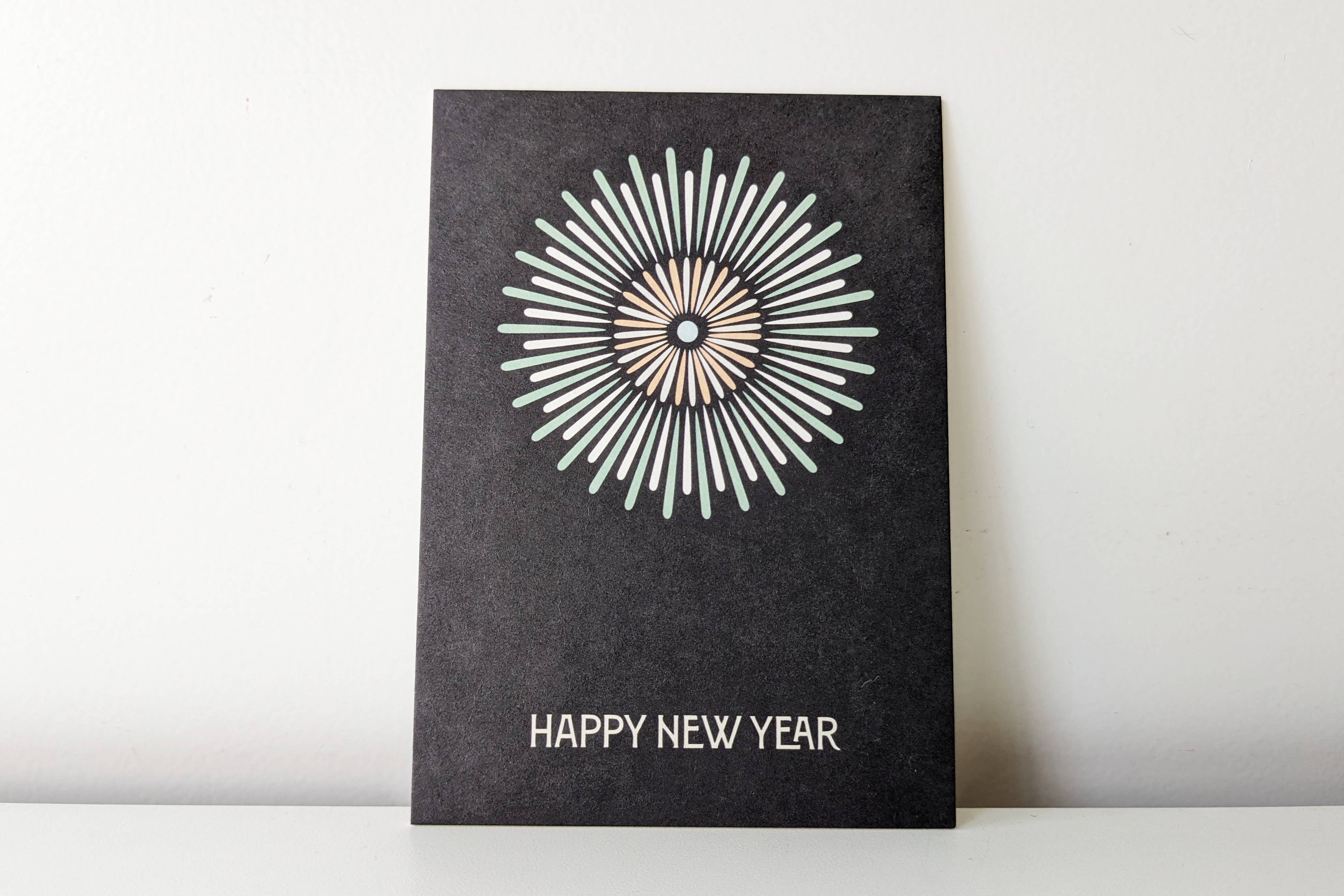 Glückliches neues Jahr-Karte | Silvester | NY Card | Feiertagskarte - Gedruckt auf 110 Pfund Papier (Kartonpapier). - Leere Karte. - 4,25 X 5,5 „(Größe A2) - Alternativ bieten wir auch eine Größe von 5 X 7 Zoll (Größe A7) an. - Kommt mit einem passenden Umschlag in einer individuellen Kunststoffhülle/wiederverschließbarer Cellobeutel. - Erstellt aus der Originalzeichnung mit Aquarell, Aquarellstiften und Tinte und auf Kartonvorrat gedruckt. - Für Anpassungen kontaktieren Sie uns bitte.