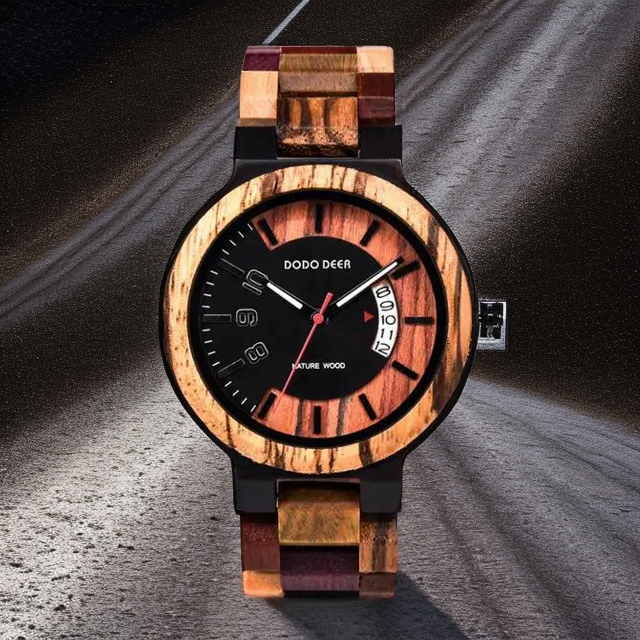 Entdecken Sie unsere beeindruckende Holzuhr, die sorgfältig gefertigt wurde, um die Schönheit der Natur mit zeitloser Eleganz zu verbinden. Mit einem kunstvollen Holzmaserungsmuster und präziser Verarbeitung ist sie ein einzigartiges Accessoire, das jedes Outfit mühelos ergänzt.