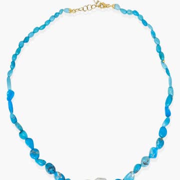 Lassen Sie Ihren Stil mit dieser atemberaubenden Statement-Glasstein-Halskette mit Perlen und Kristallen zum neuen Klassiker werden. Es blendet immer wieder in seiner skurrilen Form und leicht zu übersehenden Größe, mit eng angesetzten glänzenden Perlen und perfekt geschliffenen Brillantsteinen an vorderster Front! Der Karabinerverschluss sichert das Halsstück. Dieses handwerkliche Wunder ist ein Muss und eignet sich auch hervorragend als Geschenk für Ihre Familie und Freunde. Statement-Halskette mit Aquamarin-Glassteinen Materialien: Verzierte Kristall- und Perlenkette Größe: 21" Länge - 2,3" breit Karabinerverschluss mit 7" Extender