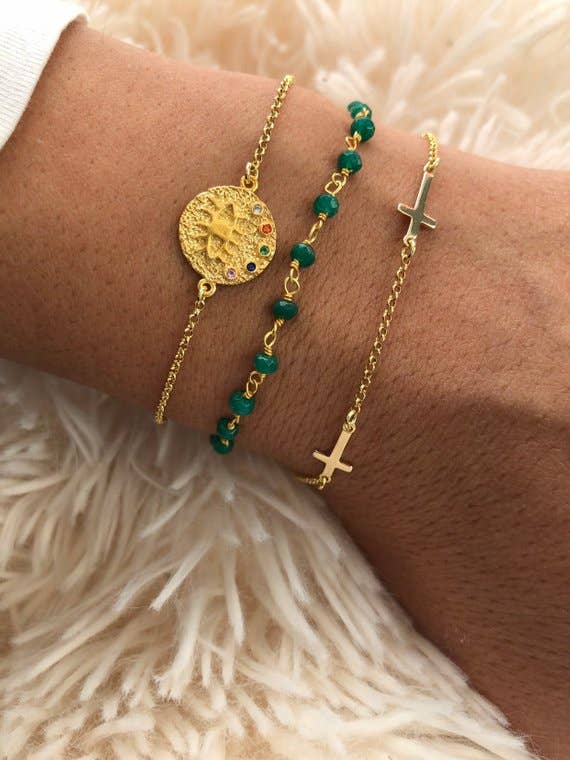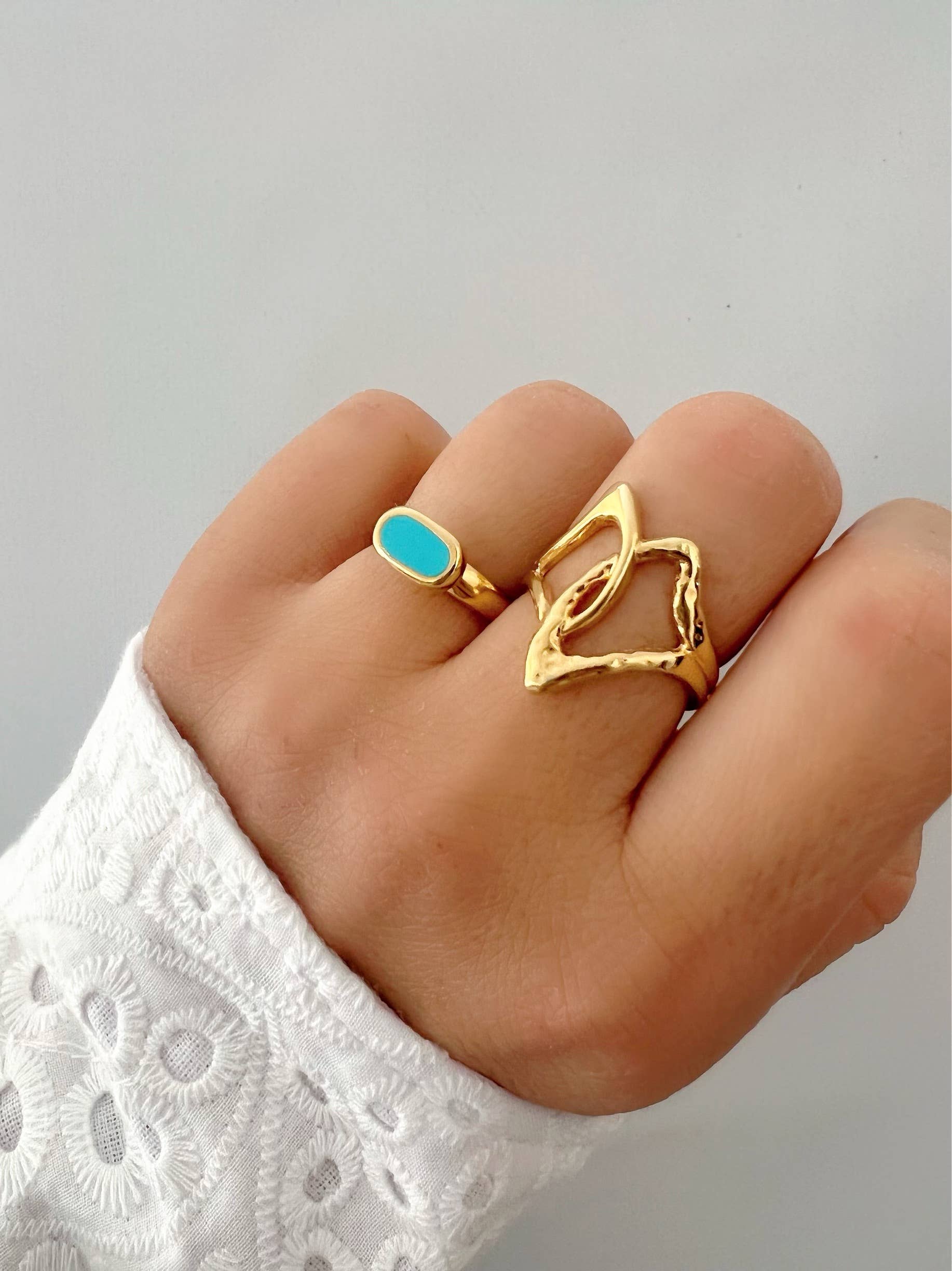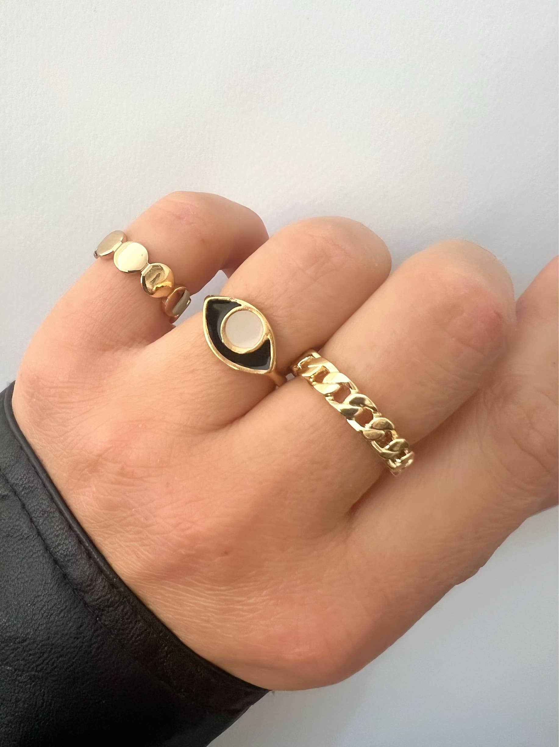 Vier verschiedene stapelbare Ringe in Goldfarbe, die aus Sterling Silber 925 gefertigt sind. Der erste ist ein breiter Ring, der zweite ist ein dünner Bandring mit einem schwarzen Stein in der Mitte, der dritte ist ein Ring mit zwei Kettenblättern, die miteinander verbunden sind und einen einzigartigen breiten Ring bilden, und der letzte ist ein Herzring, der dieses ganz besondere Set vervollständigt. Alle von ihnen sind leicht verstellbar und bestehen aus Sterling Silber 925. Sie finden sie nur im Christina Christi Store. MATERIALIEN - Alle Ringe sind aus vergoldetem 925er Sterlingsilber gefertigt. ABMESSUNGEN - Der Durchmesser der Ringe beträgt 17 mm (0,67") - US 7 - Leicht verstellbar. SCHUTZ - Stellen Sie sicher, dass Sie Ihren Ring nicht zu oft belasten oder öffnen und schließen, da es nur natürlich ist, dass er kaputt geht! Wenn Sie es anpassen möchten, tun Sie es vorsichtig und verlassen Sie niemals das Größenspektrum, das ich bei jedem Ring beschreibe. - Schützen Sie es vor Wasser, Parfums, Haaren und Körperlotion, um sie jahrelang strahlend und glänzend zu halten. * IN DIESER AUFLISTUNG GIBT ES VIER VERSCHIEDENE
