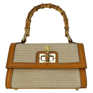 Die mit Nieten verzierte NINA-Tasche gibt es jetzt in einer Miniaturversion! Die MINI NINA ist eine kleine Raffiatasche mit einem durchbrochenen Klappdeckel und einem mit Nieten verzierten Rand. Sie kann mit der doppelten goldenen Kette als Umhängetasche oder Schultertasche getragen werden. Der Reiz der Mini-Tasche hält auch diese Saison unvermindert an. Mehr als nur ein Trend, wird die Mini-Tasche zum Klassiker und zu einem festen Bestandteil unserer Marke. Die kleine Raffiatasche ist das Sommeraccessoire, um Ihr Tages- oder Abendoutfit aufzupeppen! Maße: Breite 15 cm x Höhe 11 cm x Tiefe 4 cm Details: - Ungefüttert - Magnetverschluss - Klappe mit goldenen Nieten am Rand Material: Natur-Raffia Handgefertigt
