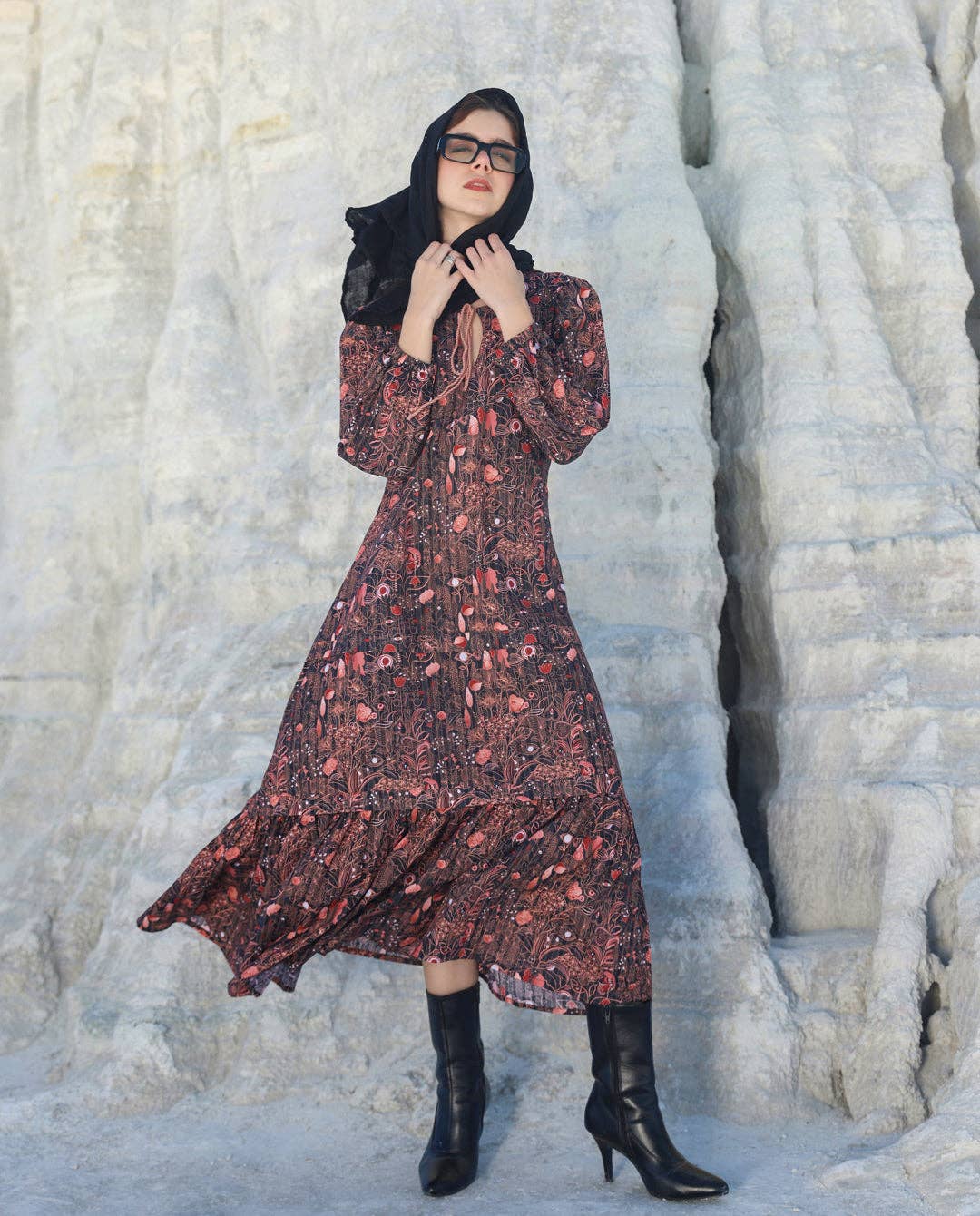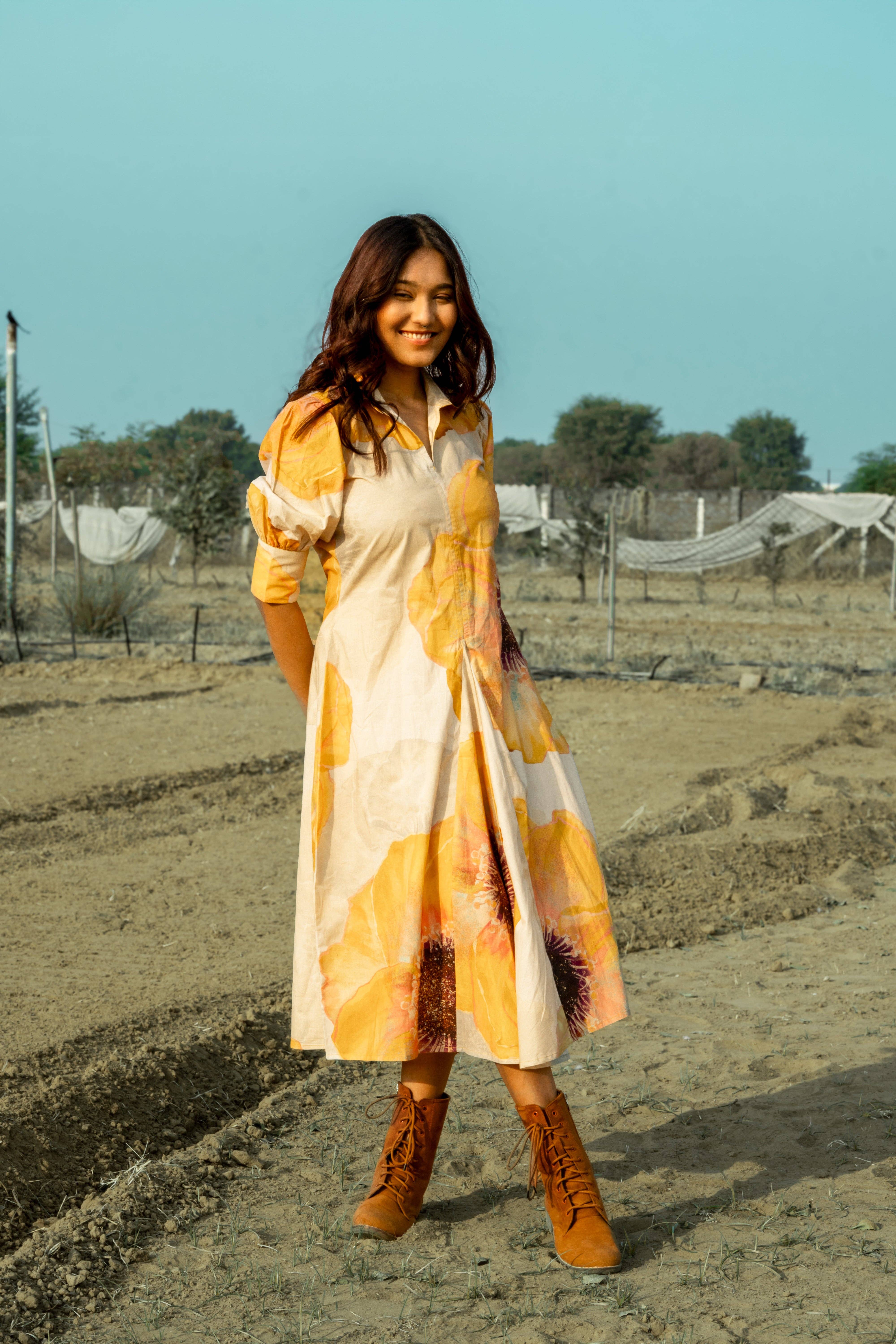 PRODUKTDETAILS Eine Vision zeitloser Weiblichkeit, dieses Midikleid ist mit aufwendigen botanischen Drucken in satten Siena-Tönen verziert. Mit zarten Puffärmeln und einer weichen, fließenden Silhouette bietet es eine perfekte Mischung aus Struktur und Leichtigkeit. Ob mit markanten Stiefeln für einen Hauch von Kante gestylt oder klassisch mit minimalem Zubehör gehalten, dieses Stück ist für mühelosen Charme und stille Selbstsicherheit entworfen. Spezifikationen
