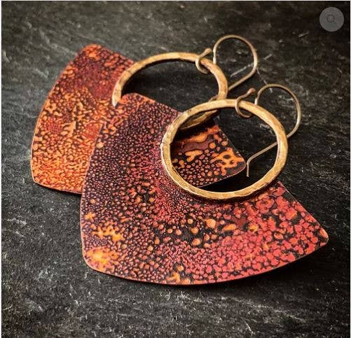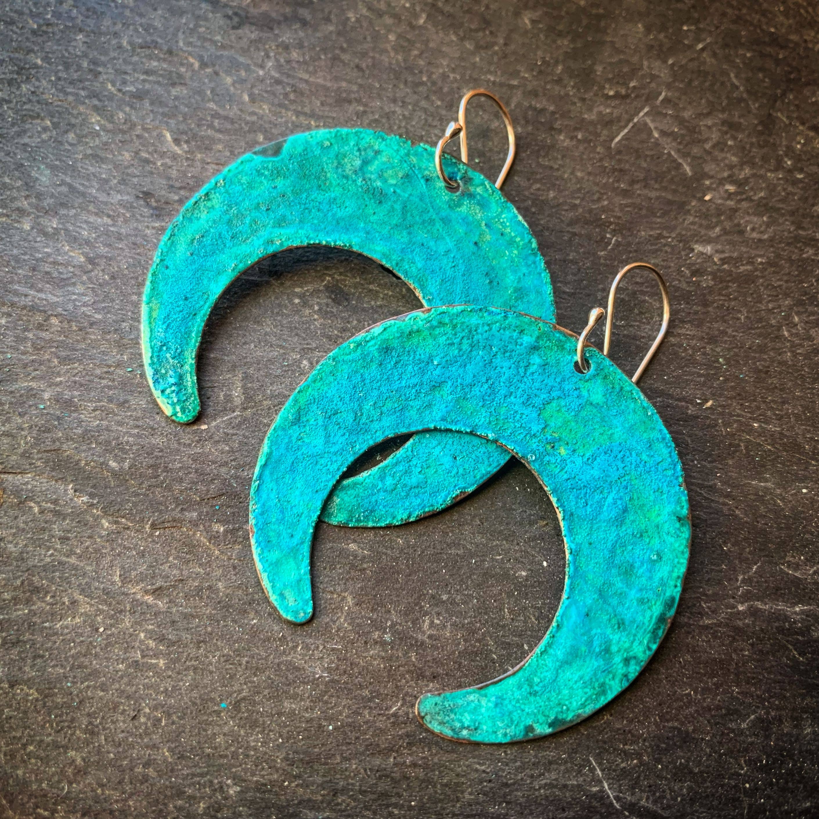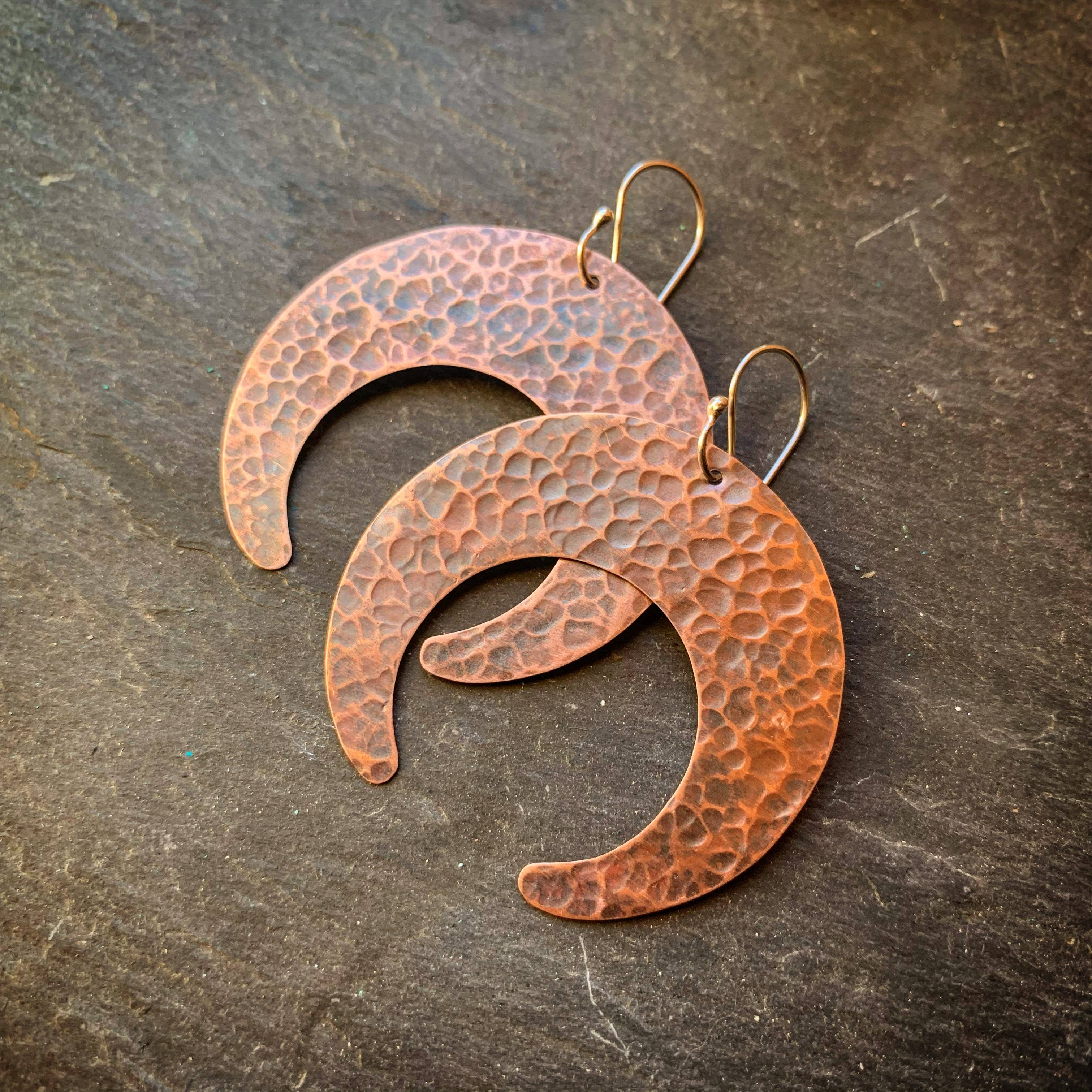 Handgehämmerte, geschnittene und abgesteckte Messing-Salbmondformen (traditionelle „Squash Blossom“ -Form) mit handgefertigten Sterlingsilber-Ohrdrähten. Materialien: Messing, Sterlingsilber. Größe: Ungefähr 2 1/2 „in der Länge und 2" an der breitesten Stelle.