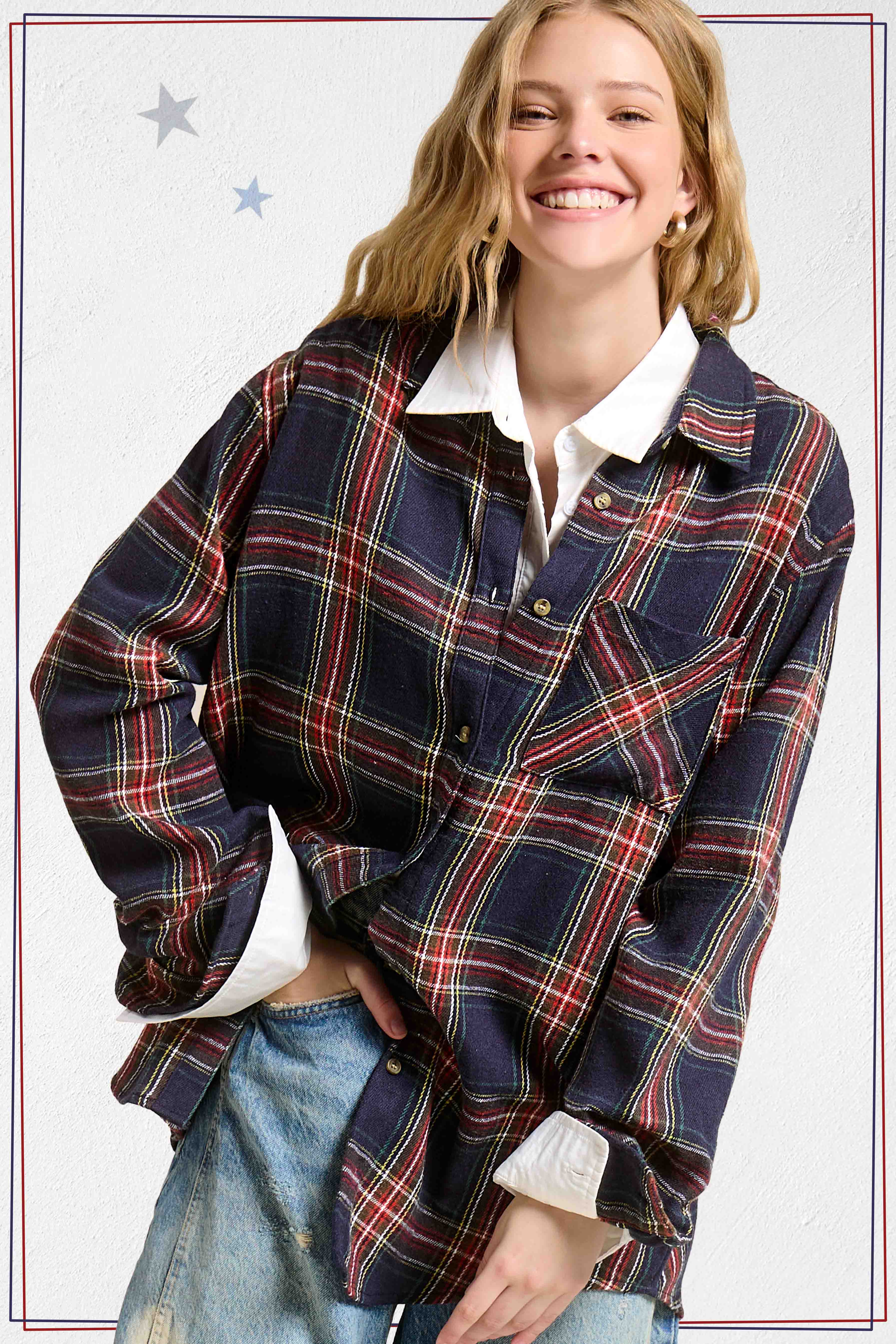 Das klassische karierte Hemd ist für alle Jahreszeiten geeignet. Es verfügt über einen Kragen, eine durchgehende Knopfleiste, eine Brusttasche und lange Ärmel, die Sie aufkrempeln oder herunterlassen können für einen tollen Look. Wir haben dieses Hemd oversized geschnitten, damit Sie einen entspannten und mühelosen Stil genießen können. Kombinieren Sie es mit Ihrem Lieblingsoberteil, Hosen und Schuhen für vielseitige Looks.