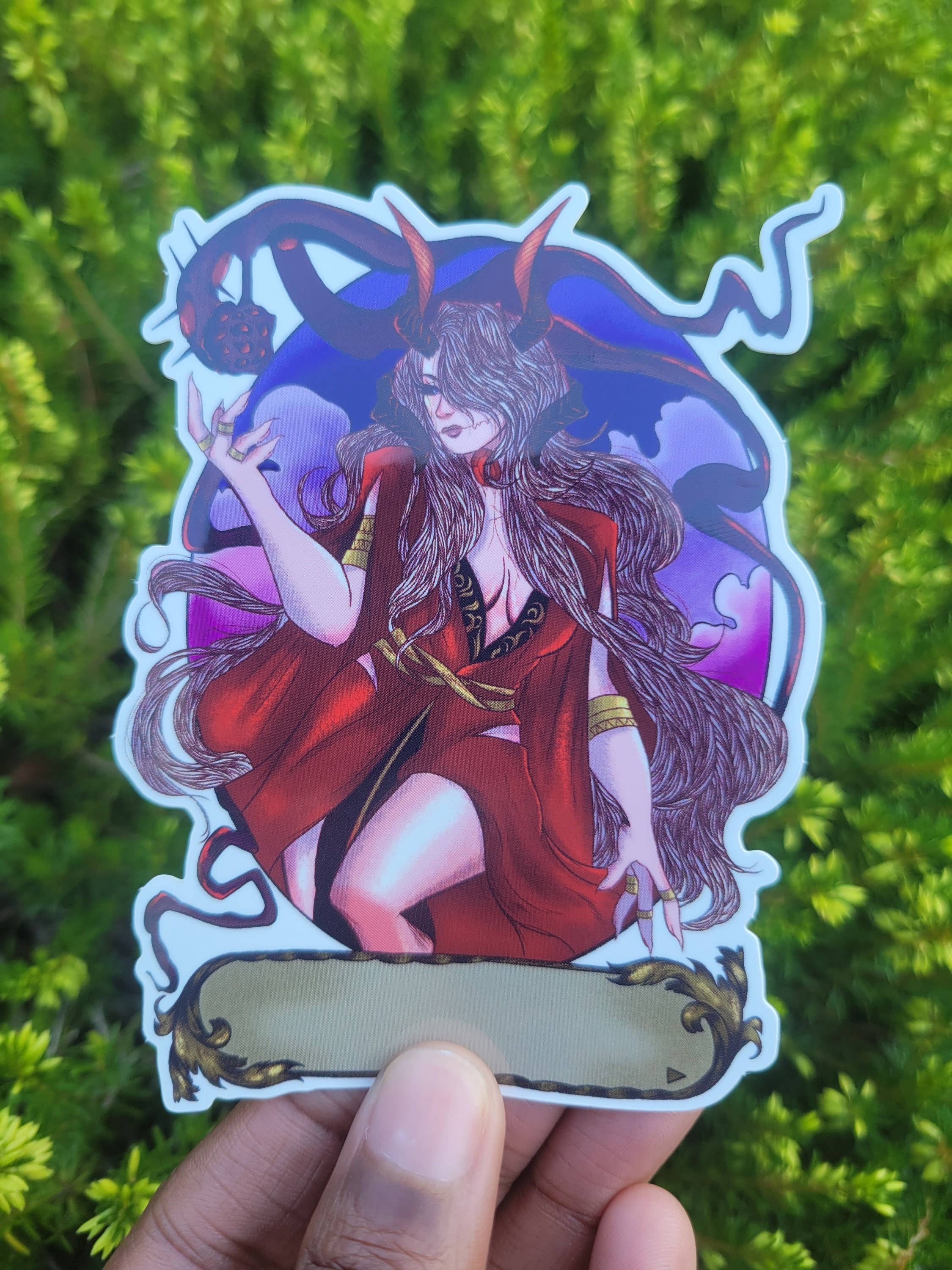Verzaubere dein Skizzenbuch, Laptop oder deinen Sarg mit diesem verführerischen Vampirmädchen-Aufkleber! Zeigt eine vampirische Adlige in ihrem feinsten Kleid mit ihrer Horde von Fledermäusen um sie herum, beleuchtet von einem blutroten Halbmond! - Konturgeschnittene Vinylaufkleber - Jeder Aufkleber ist ungefähr 10 cm groß - Nur einzeln erhältlich Bitte beachten Sie, dass beim Kauf des Aufklebers ohne weitere Artikel kein Versand mit Sendungsverfolgung erfolgt! Ein Aufkleber wird mit Sendungsverfolgung geliefert, wenn er zusammen mit anderen Artikeln wie Drucken oder Anhängern gekauft wird!