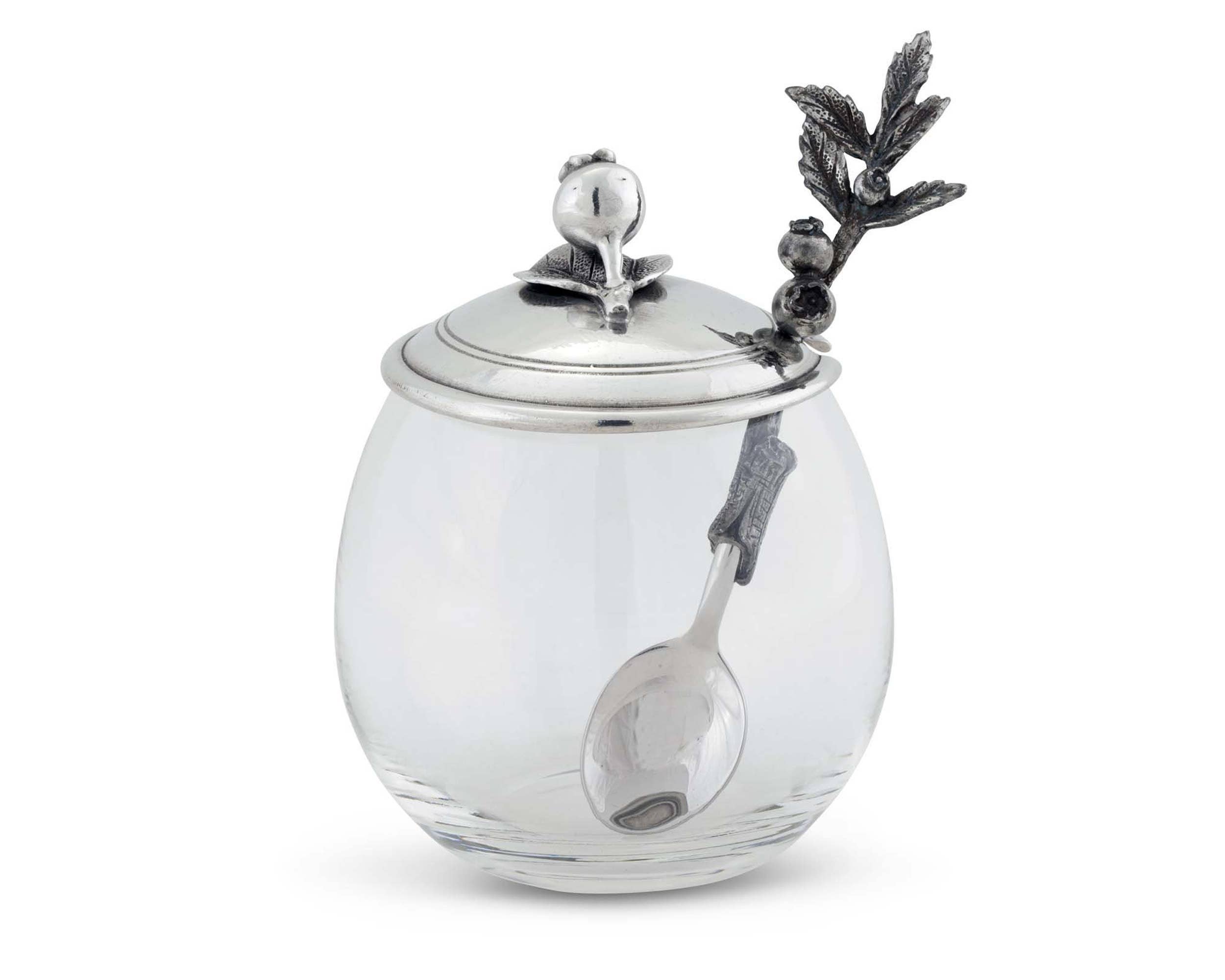Perfekt für Picknicks und Mahlzeiten im Freien setzt dieser Apple Honigtopf von Vagabond House in jeder Umgebung einen schönen Akzent. Die klare Glasschale dient als Basis, während der Deckel aus reinem Zinn einen Zweig mit fein geäderten Blättern zeigt. Ein weiterer Zinnzweig bildet den Griff des Löffels, der am Ende von kleinen, realistisch gestalteten Äpfeln und weiteren Blättern begleitet wird. Die Laffe des Löffels, die im Honigtopf enthalten ist, öffnet sich zu einer breiten Schale. Größe: 10,2 cm Breite x 12,7 cm Höhe. Pflegehinweis: Handwäsche empfohlen, mit einem weichen Tuch trocknen.