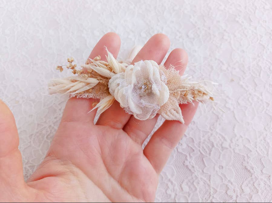 Cremefarbenes Nylon-Gummiband in Einheitsgröße. Jede Stickapplikation wird einzeln von Hand genäht. Gestickte Blumen können ein wenig variieren.