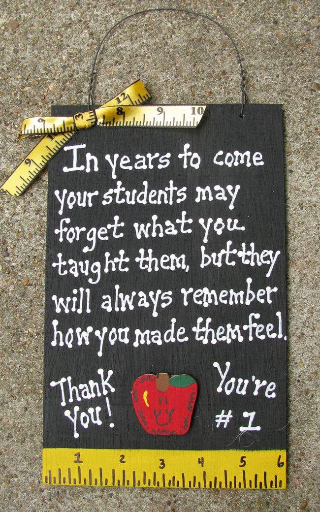 Die Tafel ist schwarz bemalt. Hat ein Lehrerschleife und einen Apfel. Mit einem Lineal, das am unteren Rand gemalt ist. Das Gedicht lautet: In den kommenden Jahren werden Ihre Schüler vielleicht vergessen, was Sie ihnen beigebracht haben, aber sie werden sich immer daran erinnern, wie Sie sie fühlen ließen. Danke! Sie sind die Nr. 1. Handgefertigt in Deer Park, TX. Maße: 9 Zoll hoch und 5 3/4 Zoll breit. Das Band variiert je nach Verfügbarkeit zum Zeitpunkt der Bestellung. Es wird ein Linealband sein, nur heller in der Farbe.