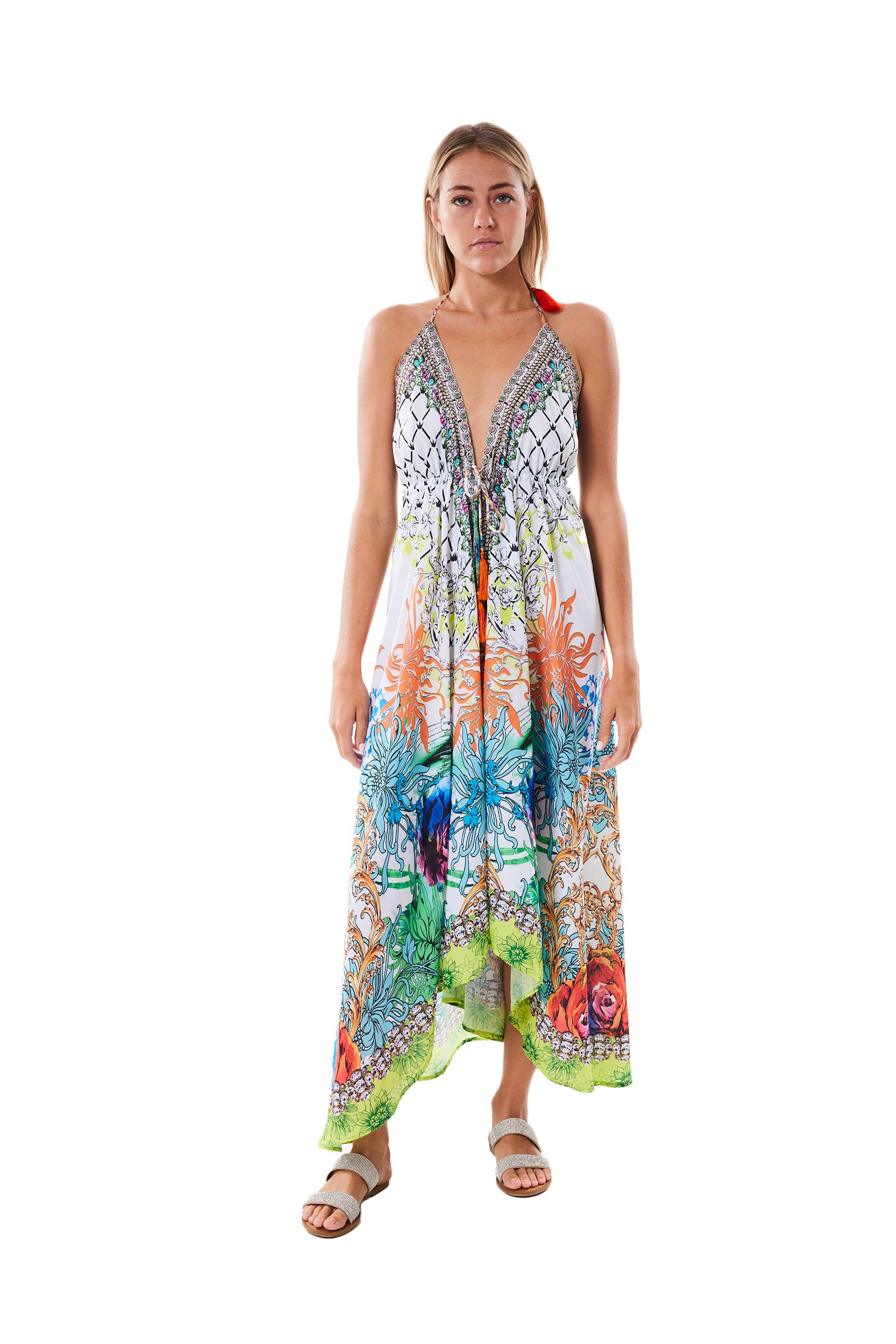 - Wunderschönes Kleid aus Viskose in Meeresblau. - Handgefertigter, schimmernder Stoff mit Handarbeit und Sequenzverzierungen. - Packung enthält 2 S/M und 2 One Size Fits All. - Perfekt für eine Feiertagsfeier oder eine perfekte Kreuzfahrt.