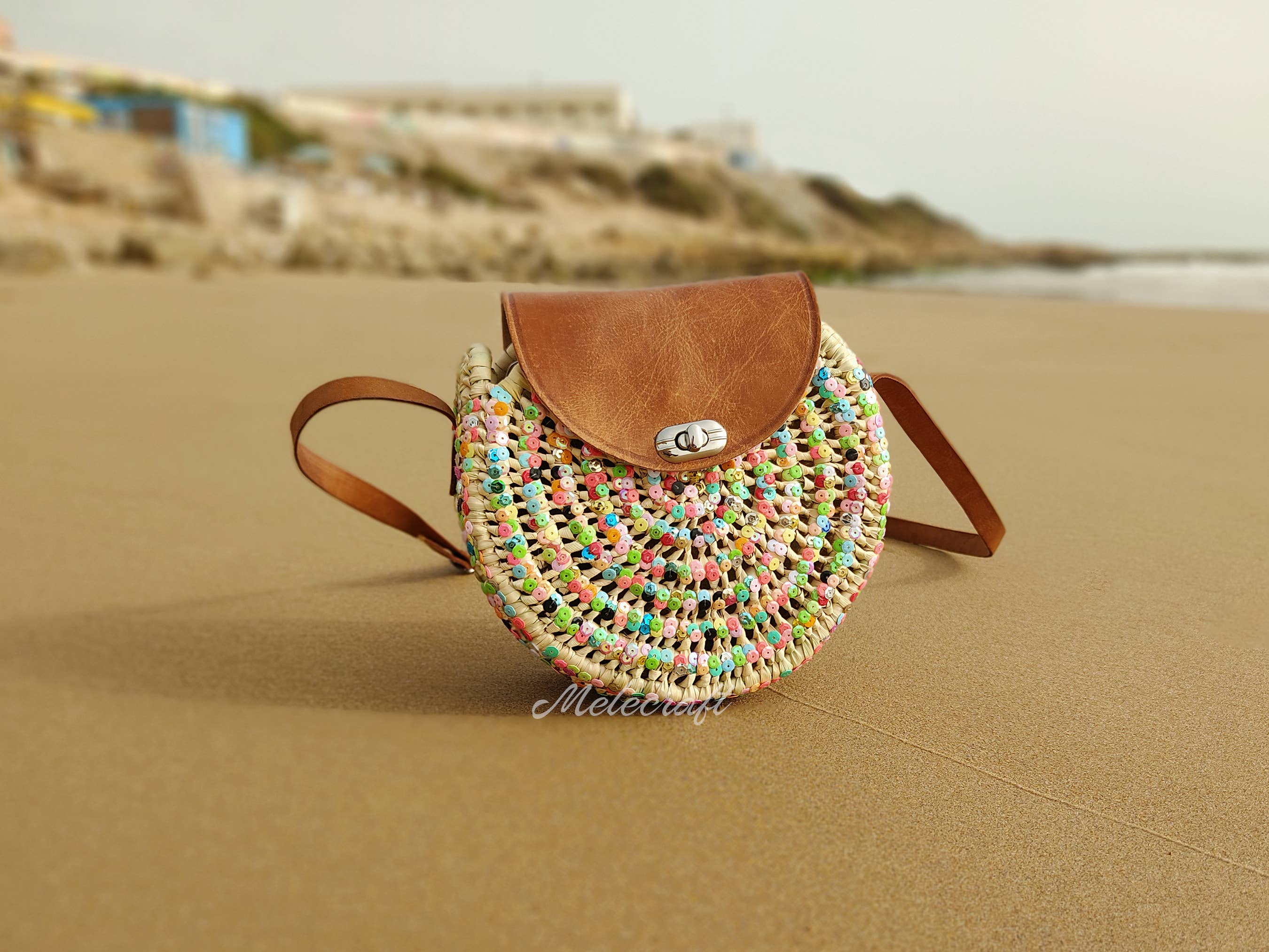 Die mehrfarbige Paillettentasche ist nicht nur ein praktisches, sondern auch ein sehr stilvolles Accessoire für Ihre Ausflüge an einen sonnigen und heißen Strand. Sie ist eine große Paillettentasche, gewebt aus natürlichen Palmblättern, mit eleganten, gerollten Ledergriffen. Diese Einkaufstasche mit Pailletten kann sich durch ihre einzigartigen Eigenschaften von der Masse abheben und Ihnen Komfort bieten, wenn Sie all Ihre Sachen während Ihres Strandausflugs oder einer Einkaufstour tragen. Diese übergroße Strohtasche ist ideal für alltägliche Anlässe wie Sommer, Strand, Schwimmbad, Urlaub, Resorts, Reisen, Arbeit, Einkaufen, Verabredungen. Maße ca.: - Höhe: 18 cm /7,2 Zoll - Länge: 24 cm/9,5 Zoll (oben), 11 cm/4,3 Zoll (unten) Die Abmessungen dieser Strohkorbtasche sind nur ungefähre Angaben, da alle Körbe handgefertigt sind und daher völlig einzigartig sind und sich geringfügig in der Größe unterscheiden. • Ethische und umweltfreundliche Alternative zur Einkaufstüte aus Plastik, handgewebte Wildpalme „Doumdoum“ in Marokko Natürliches Gerben von Leder
