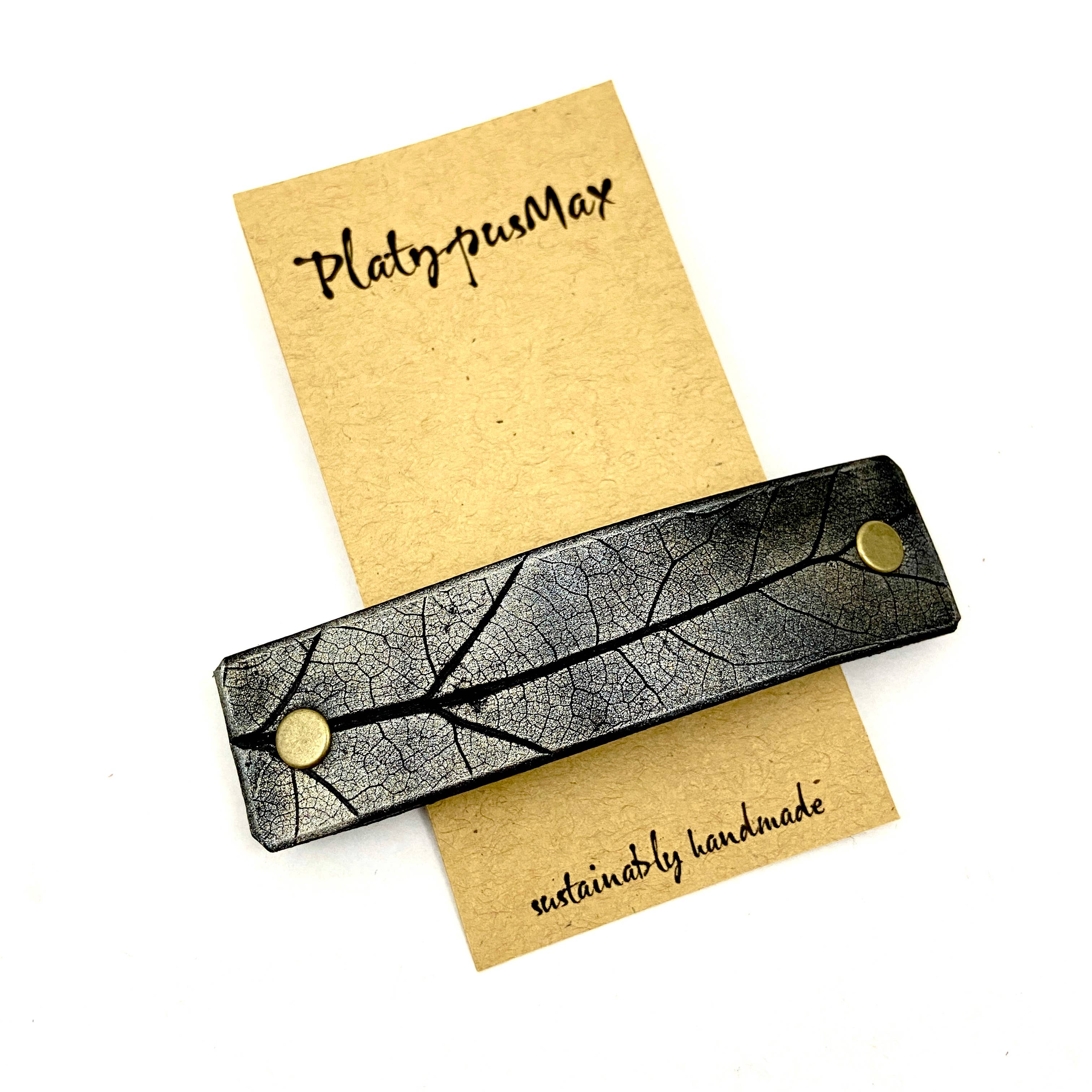 Diese Haarspange aus Leder verfügt über eine geprägte Blattdruckstruktur aus schwarzem Leder mit einer schönen metallischen Oberfläche. Diese handgefärbte und handbemalte Oberfläche hat ein einzigartiges metallisches Aussehen, aber der Clip ist nicht schwer wie Metall und neigt auch nicht zum Anlaufen. Die Töne passen zu einer Vielzahl von Farben und Metallen in Ihrem Kleiderschrank und eignen sich hervorragend für den täglichen Gebrauch. Es ist ein tolles Geschenk für alle mit langen Haaren, die nach einer Haarspange suchen, die überall getragen werden kann; eine schöne praktische Alternative zu Schmuck. GRÖSSEN: Klein • Der Clip: 2,25" (60 mm) • Oberes Designstück aus Leder ist 2,75 „x .6" (14 x 70 mm) Mittel • Der Clip: 2,6"/70 mm • Oberes Designstück aus Leder: 3,2"/ 85 mm x .75"/19 mm Große • Der Clip: 3 „(80 mm) • Leder-Designstück ist 3,75 „x 0,75" (100 mm x 20 mm) Extra groß • Der Clip: 4 „(100 mm). • Leder-Designstück ist 4,75 „x 0,75" (120 mm x 20 mm)