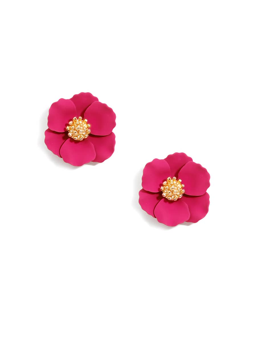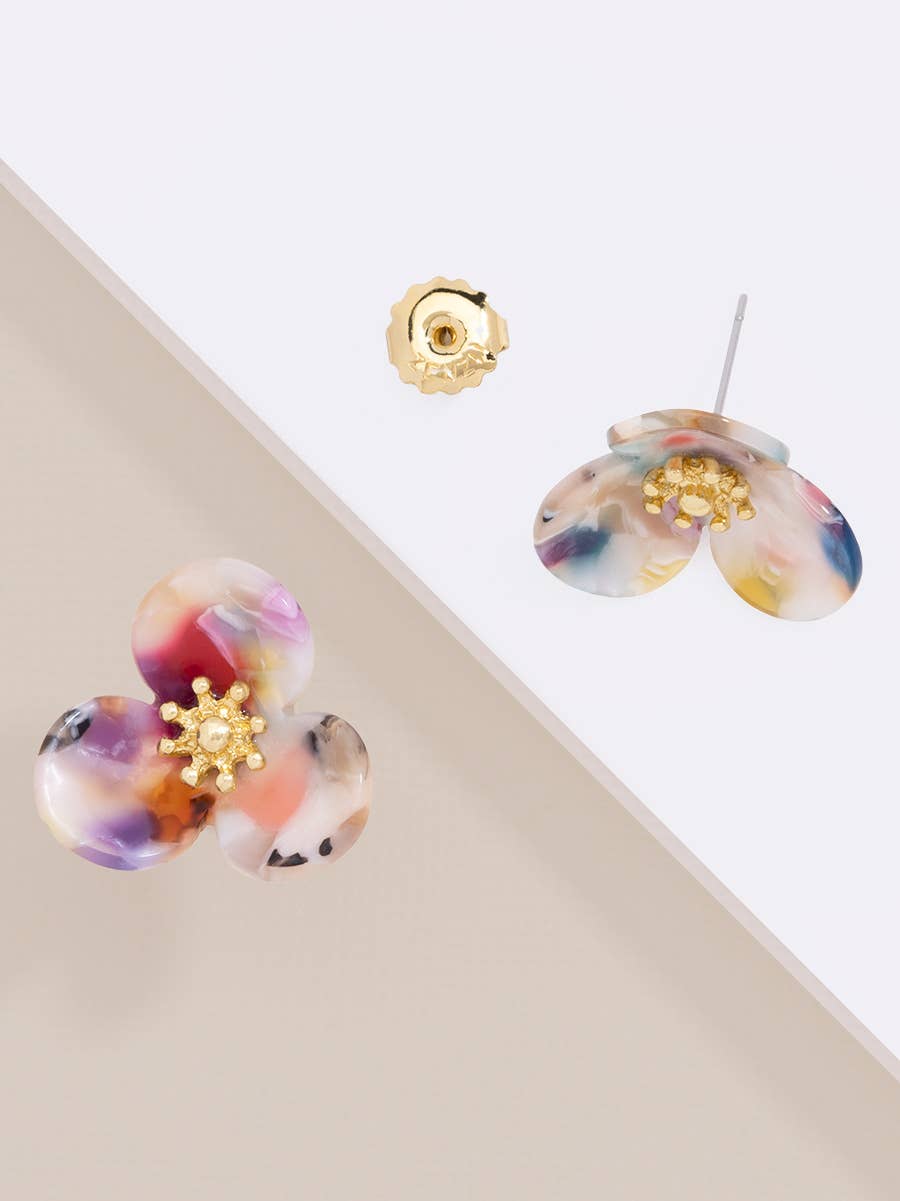Ohrstecker aus glitzerndem Harz in Form einer fünfblättrigen Blume. -Beitrag zurück -Reine Rohstoffe -1,5 Zoll Länge -1,5 Zoll Breite -Nickel- und bleikonform (hypoallergen)