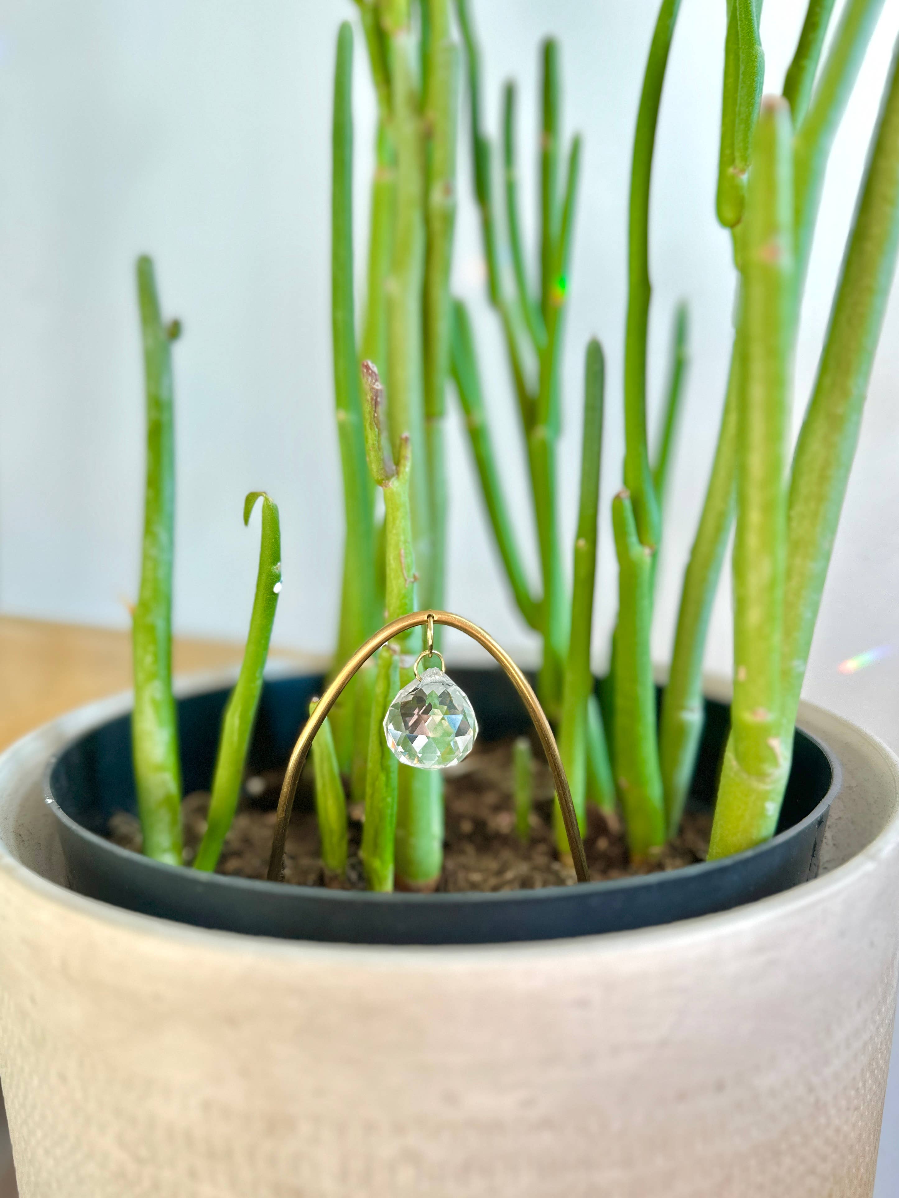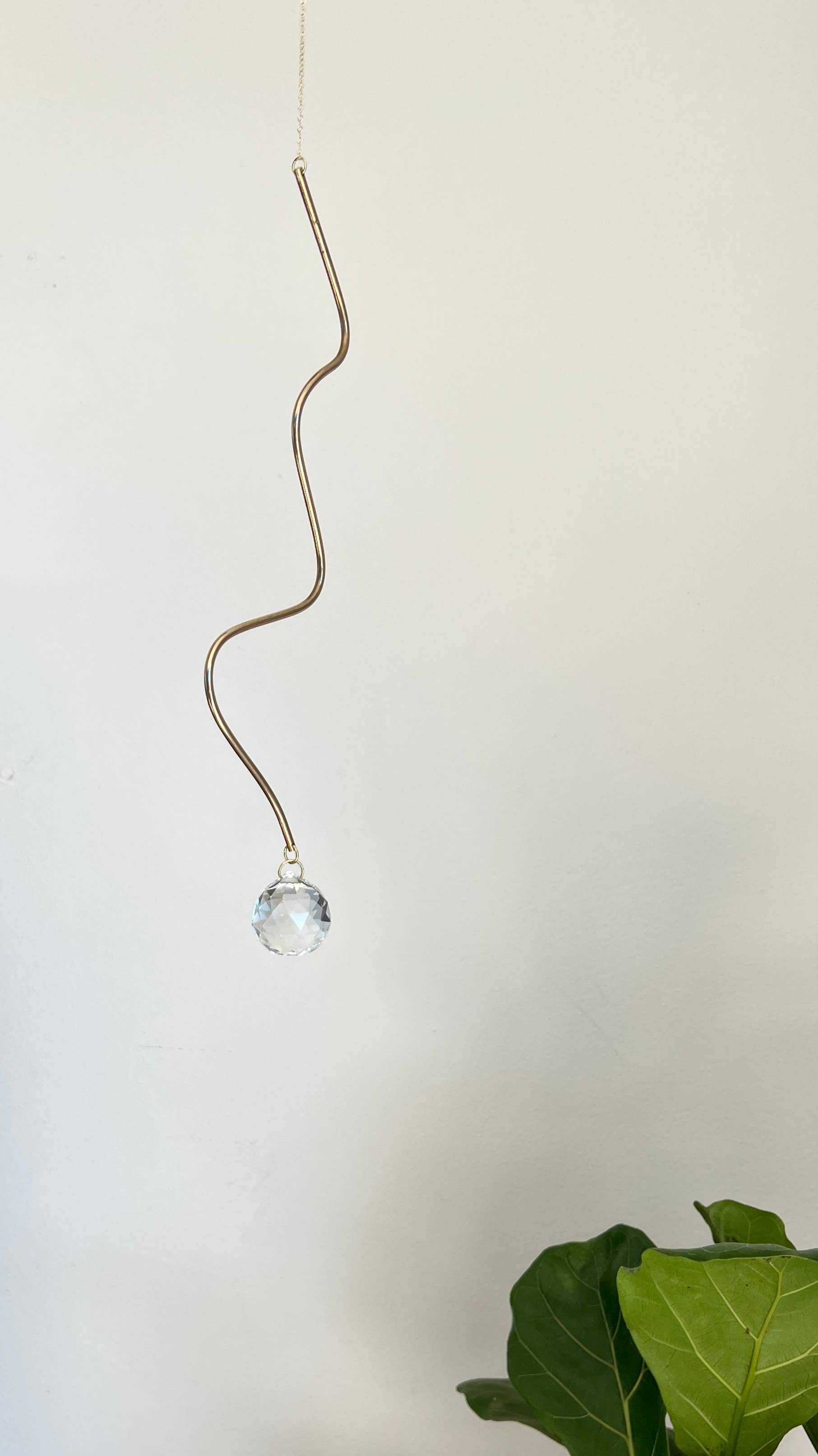 Squiggle Plant Stake Suncatcher aus Messing, ein modernes Messingstück, das Ihre Pflanzen noch schöner macht. Hergestellt aus einem Messingstab und einem 20 mm großen Kristall Wenn die Sonne auf den Kristall trifft, prallen wunderschöne kleine Regenbögen im ganzen Raum ab. Sie funktionieren am besten, wenn sie direktem Sonnenlicht ausgesetzt werden. Stecken Sie es direkt in einen Blumentopf und genießen Sie die Regenbögen. Ein einzigartiges Geschenk für jeden in Ihrem Leben!