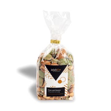 Herstellungsland: Spanien Ernährungsweise: Alkoholfrei, Glutenfrei, Milchfrei, Vegan und Vegetarisch Haltbarkeit: 24–36 Monate Herstellung: Gentechnikfrei Inhaltsstoffe: Baumnüsse und Erdnüsse Lagerung: Lagerfähig Saison: Ganzjährig Inhaltsstoffe: Sonnenblumenfrittierter Mais, Würzung: Honig, Zucker, modifizierte Stärke, natürliches Aroma, sonnenblumenfrittierte Erdnuss, Würzung: Zucker, Honig, Stärke, Salz, sonnenblumenfrittierter Mais, Würzung: Salz, Mononatriumglutamat, Dinatriumguanylat und Dinatriuminosinat, Reismehl, Aromen (Laktose, Käse), Butter, Tomate, Dextrose, Paprika, Milchsäure und Zitronensäure, natürliches Paprikaaroma, natürliches Raucharoma, sonnenblumenfrittierte Erdnuss, überzogen: modifizierte Stärke, Zucker, Weizenmehl, Würzung: Salz, Stärke, Annatto-Extrakt, Reismehl, Zwiebel, Knoblauch, Chili, Paprika, hydrolysiertes Sojaprotein, Gewürze, Dextrose, Zitronensäure. Produktsprache: Englisch Gewicht: 180 g (6,35 oz) Artikelnr.: BAR-HM180S-50 Produktmaterialien: Vegan