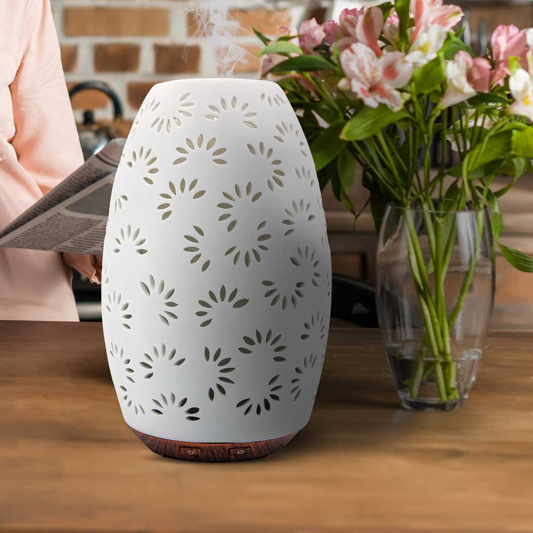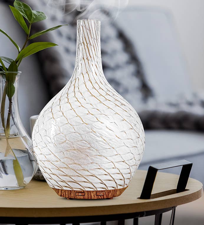 Ein Aromatherapie-Diffusor aus mundgeblasenem Milchglas, der elegant und doch charmant ist. Zeitlose Schönheit einer Knospenvase. Bereit, Ihren Raum mit ätherischen Ölen zu füllen, schließen Sie ihn einfach mit dem mitgelieferten USB-Kabel an. Abmessungen: 4 Zoll l x 4 Zoll B x 6,75 Zoll H Reichweite: Bis zu 250 Quadratfuß Laufzeit: Bis zu 12 Stunden im intermittierenden Modus Nebelmodi: Kontinuierlich, abwechselnd, aus Lichtmodi: Warmweiß, rotierende Farben, fest und aus Wasserkapazität: 60 ml Leistung: 5 V USB Automatische Abschaltung — Aus 1 Jahr eingeschränkte Garantie 888-548-0040 - Telefonnummer des Kundendienstes