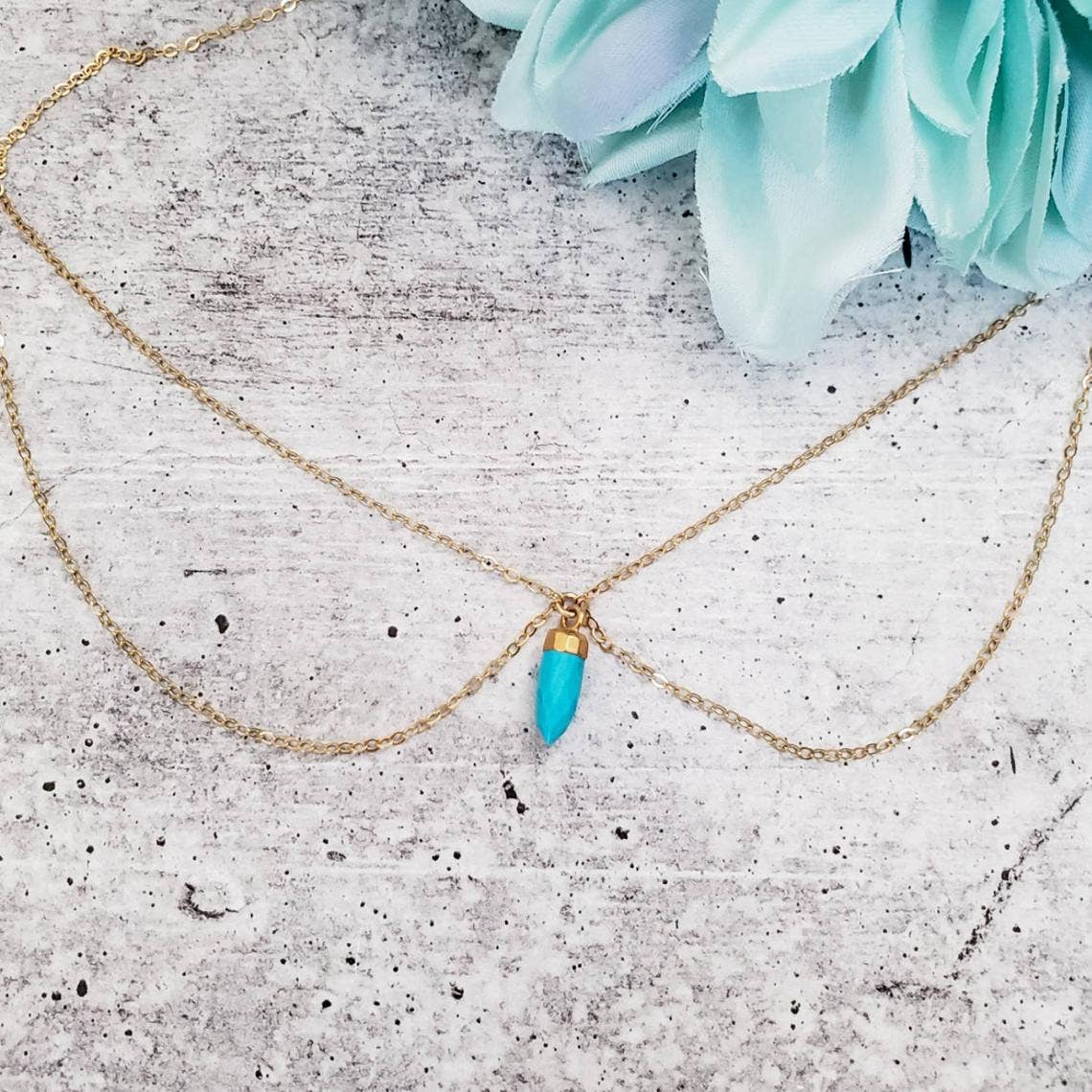 Dies ist ein wunderschöner, türkisblauer oder dunkelgrüner, glasstrukturierter Pfeilspitzen-Anhänger an einer zierlichen 18-karätigen, mit 14 Karat Gold gefüllten, zierlichen Kabelgliederkette. ÜBER DEN SCHMUCK: • Die Pfeilspitze misst 35 mm x 19 mm und ist um den Umfang mit 24-karätigem Gold galvanisiert • Die Kristallfarbe ist entweder blau oder dunkelgrün • Alle Komponenten außer dem Kristall sind wunderschön mit 14-karätigem Gold gefüllt PFLEGEHINWEISE: • Es wird nicht empfohlen, in Ihrem handgefertigten Schmuck zu schlafen, zu duschen, zu schwimmen oder Sport zu treiben • Wenn Sie Ihre Halskette aus dem Wasser halten, verlängert sich die Lebensdauer des Schmucks