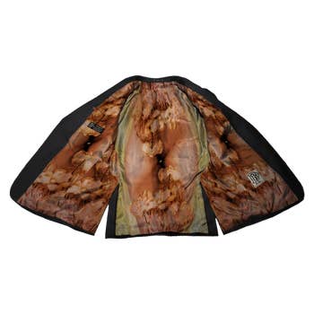 SLIM-FIT-WESTE AUS SILBERNEM LUREX-NADELSTREIFENSTOFF MIT SCHMUCKKNÖPFEN ZUR FRONTÖFFNUNG UND BLUMENBROSCHENAPPLIKATION