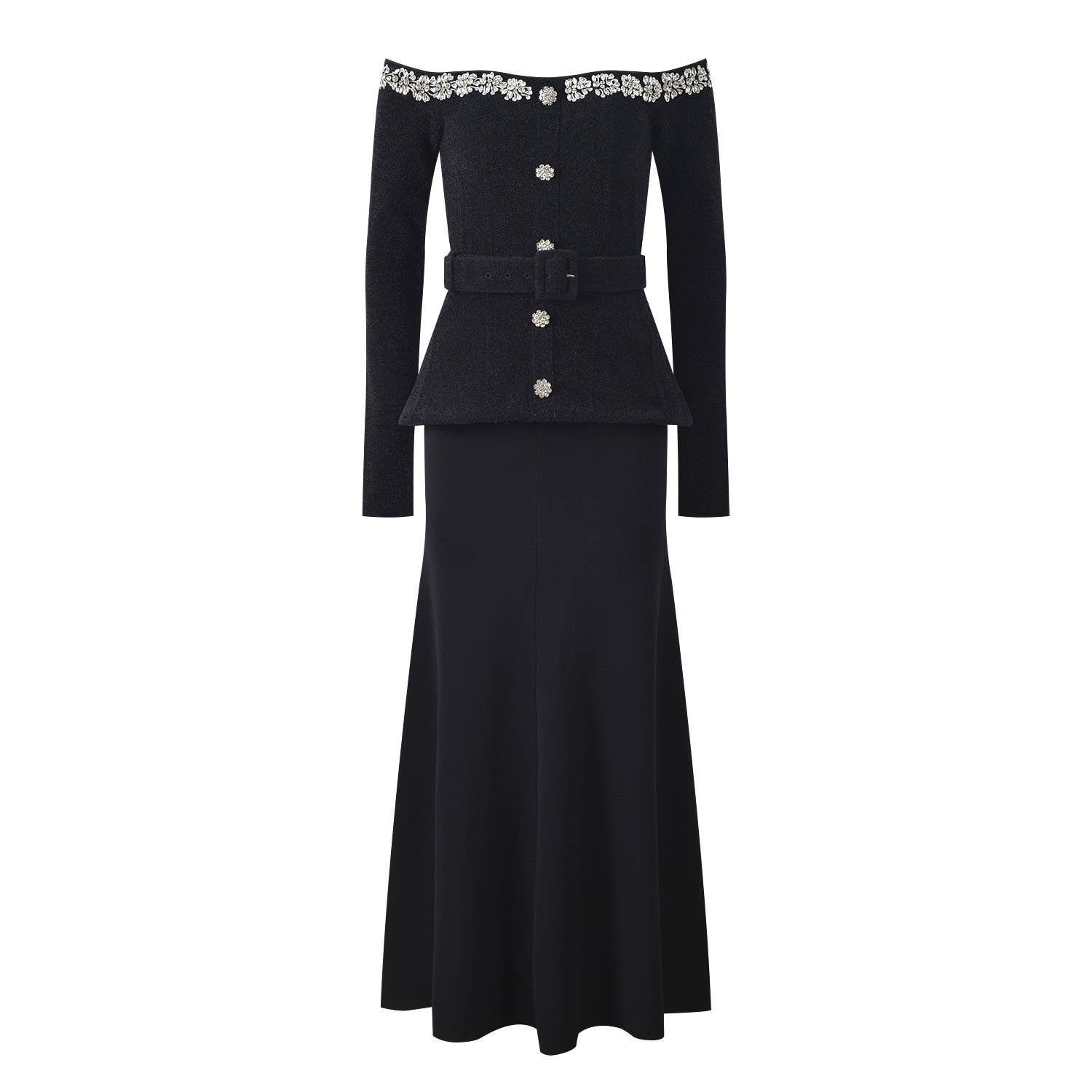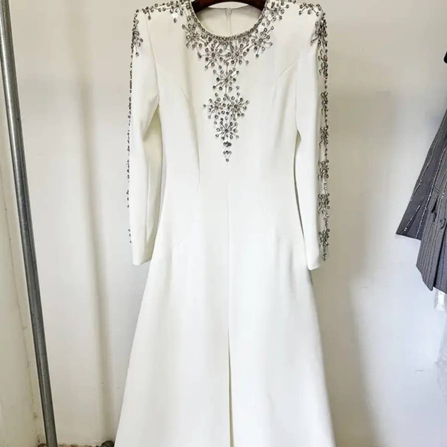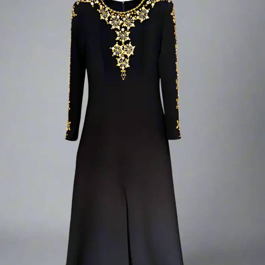 Dieses Abendkleid der neuen Saison besticht durch eine atemberaubende Kombination aus Netz-Patchwork und exquisiten, handbestickten Strassverzierungen. Die figurbetonte Silhouette betont feminine Kurven, während die halbtransparenten Netzelemente einen Hauch von moderner Anziehungskraft verleihen. Jede Perle und jeder Kristall wird sorgfältig von Hand aufgetragen und spiegelt feine Handwerkskunst und ein raffiniertes Gefühl von Luxus wider. Der lange, fließende Rock bewegt sich anmutig und ist perfekt für Galas, rote Teppiche oder elegante Feiern. Entworfen, um Raffinesse und Selbstbewusstsein auszustrahlen, fängt dieses Kleid sowohl zeitlose Schönheit als auch zeitgenössischen Glamour in jedem Detail ein.