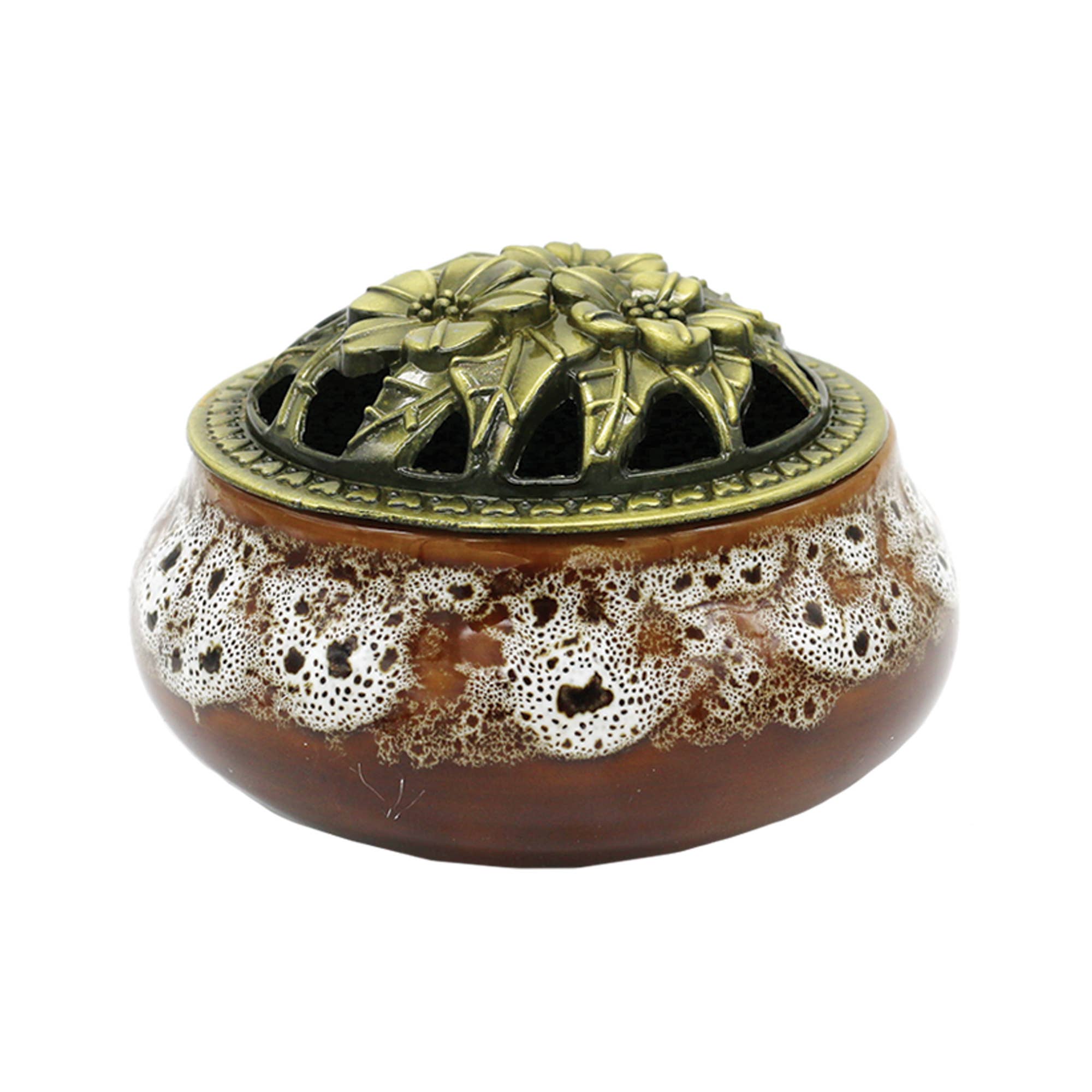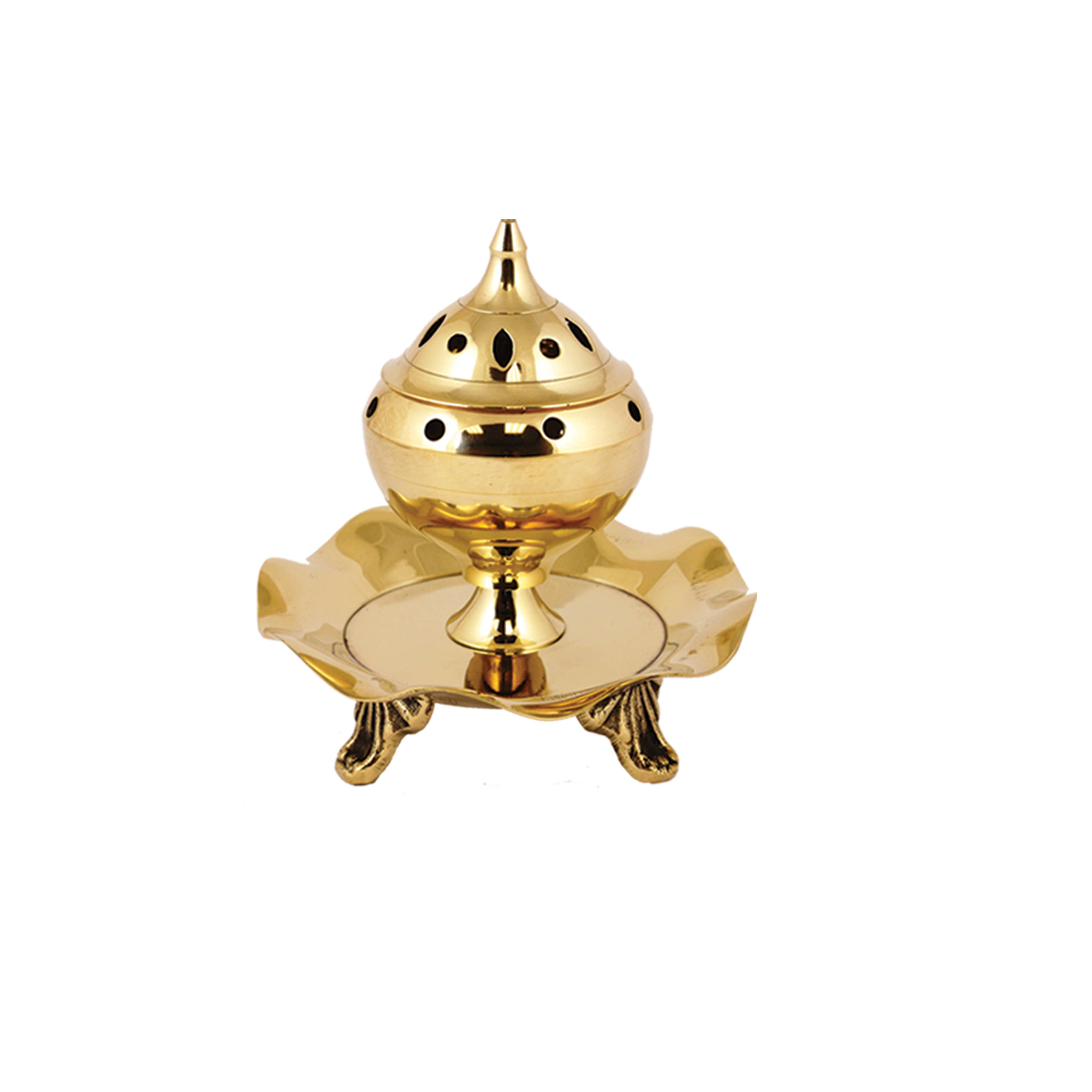 Dieses 13 cm (5 Zoll) hohe, kleine Messing-Räuchergefäß mit Sternmustern ist ideal zum Verbrennen von Harz-, Kegel- und Pulverräucherwerk geeignet. Das gelbe Messing besitzt einen glänzenden, zugleich leicht antiken Look und ist mit ausgeschnittenen Mustern verziert, die den Rauch und das Aroma des brennenden Räucherwerks frei im Raum verteilen. Durch die Aufhängemöglichkeit verbreitet sich der Duft besonders gut beim Segnen oder Reinigen von Räumen. Die Kette ermöglicht es, den Brenner aufzuhängen oder als Tischobjekt zu verwenden.