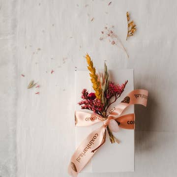 Unsere Zapfen aus Trocken- und Konservierungsblumen sind in Kraftpapier eingewickelt und haben ein Etikett aus Blumensamenpapier.