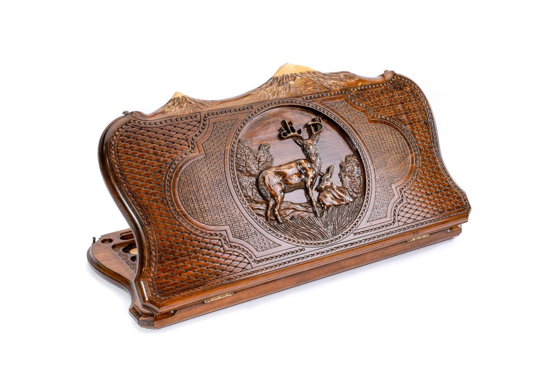 Dieses klassische Backgammon ist aus einem Stück Buchenholz geschnitzt. Auf einer Seite ist ein armenisches Ornament eingraviert. Armenische Ornamente sind reich an einer Vielzahl von Motiven, Typen und Formen. Die andere Seite des Backgammons ist für das Damespiel konzipiert. Dieses Modell ist komplett in Handarbeit gefertigt. Es ist lackiert. Die Scharniere und Schlösser sind aus Bronzeguss gefertigt. Das gesamte Spielfeld ist aus einem Stück Holz handgeschnitzt. Das Set beinhaltet: * 32 Spielsteine aus Buche und Walnussholz, mit Samtstoff auf der Unterseite jedes Stücks, * Würfel aus Billardkugeln, * Markenetui mit Holzgriff. Unsere Produkte werden mit einem 25-Jahres-Garantiezertifikat geliefert.