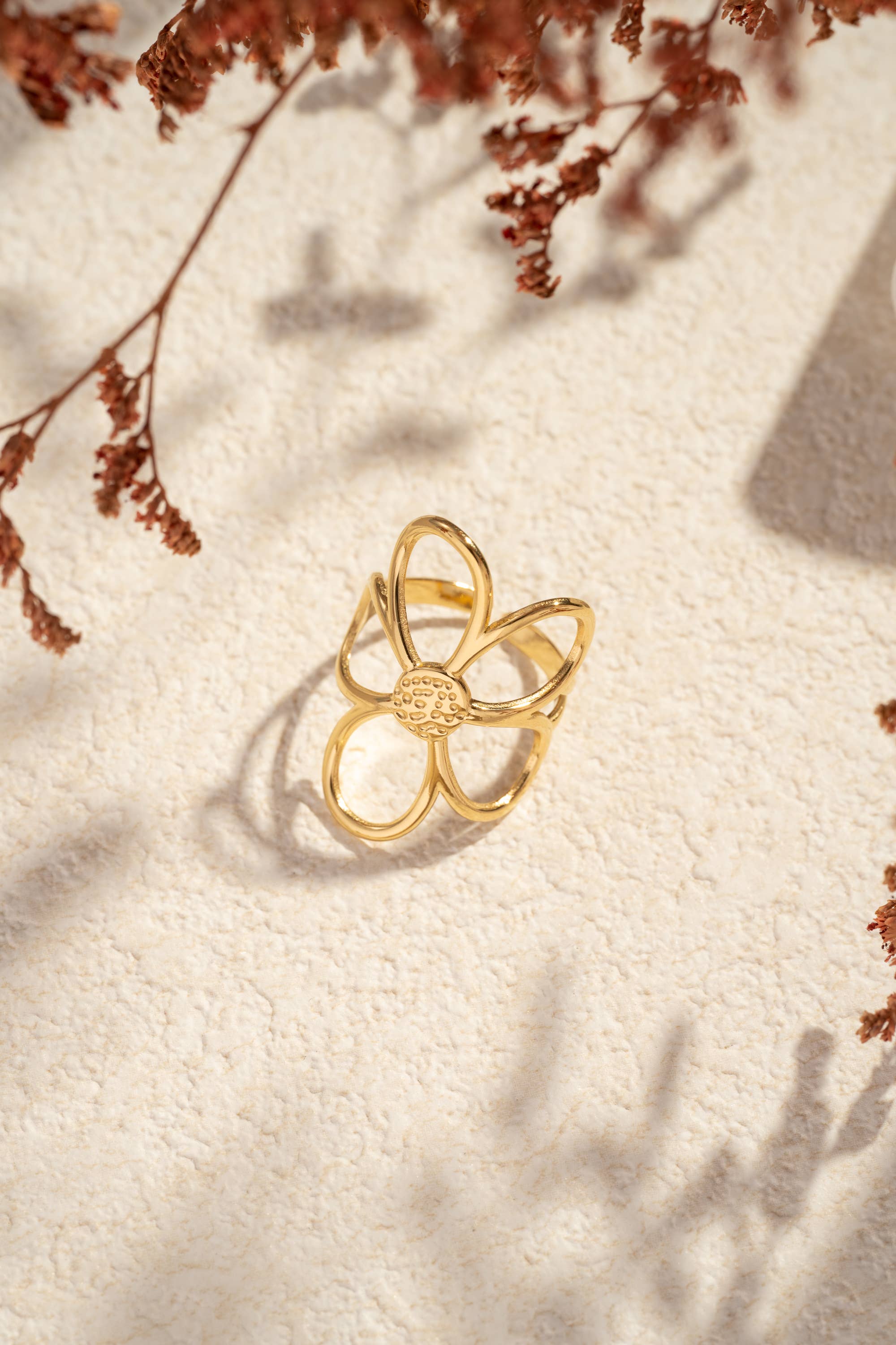 Verstellbarer Ring aus vergoldetem Edelstahl, verziert mit einem Seestern und einer fein detaillierten Muschel. Inspiriert von Meeresschätzen, erinnert er an den Sommer und Ausflüge ans Wasser. Wasserfest und hypoallergen, passt er sich allen Größen an. Aus Edelstahl, ohne Nickel, ohne Cadmium und ohne Blei.