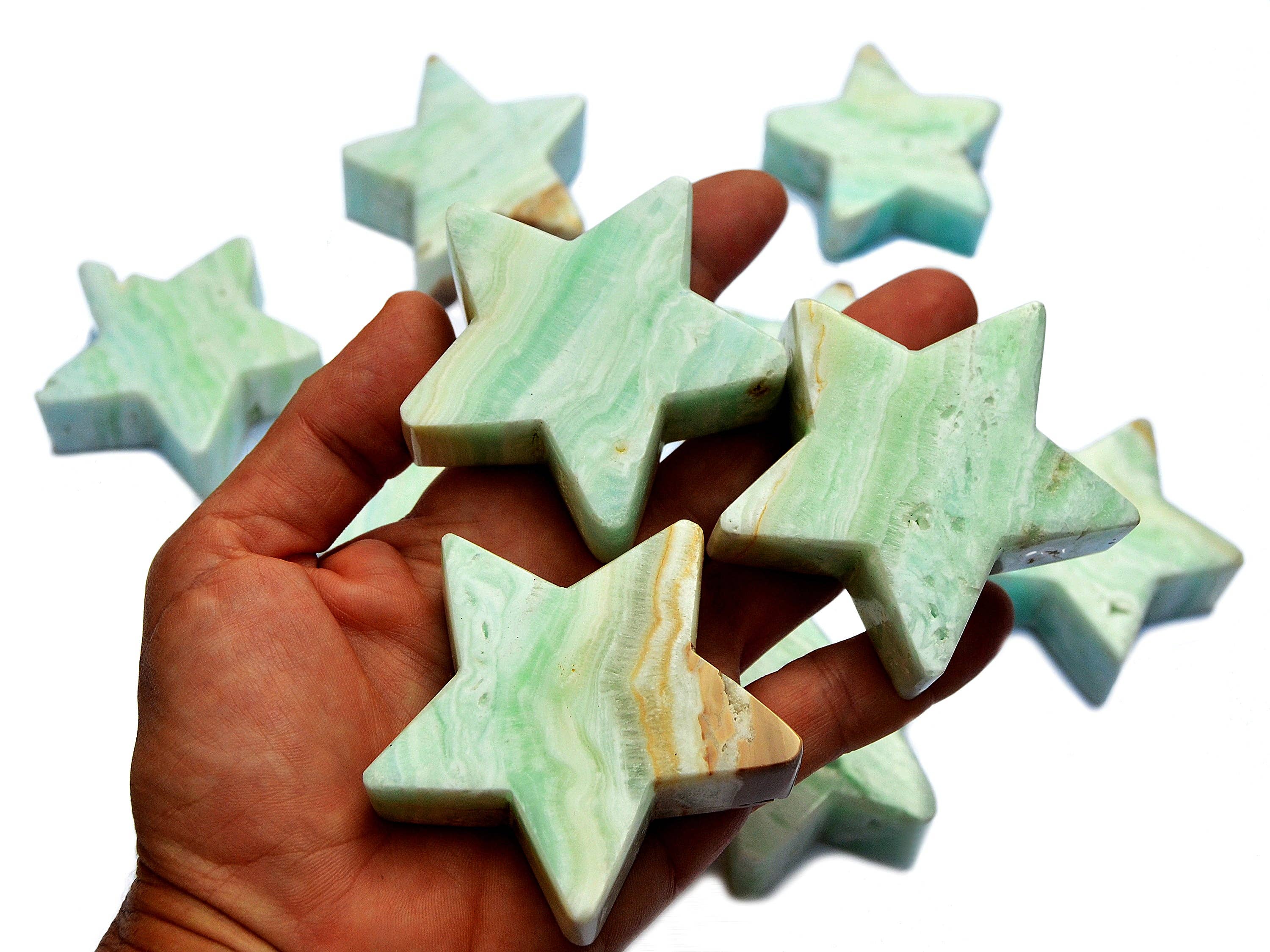 Natürlicher rosafarbener, gebänderter Onyx-Stern-Kristall. Sie erhalten einen dicken rosafarbenen, gebänderten Onyxstein, der dem Bild oben sehr ähnlich ist und nach dem Zufallsprinzip ausgewählt wurde. Bitte rechnen Sie mit leichten Abweichungen in Bezug auf Farbe, Transparenz, Größe und Form, da es einige Variationen gibt, die für jeden Stein einzigartig sind. Beachten Sie, dass alle Kristalle natürlich sind, sodass manchmal kleine Unvollkommenheiten auftreten können. Typ: Rosafarbener Onyx Farben: Rosa, Beige, Rot, Grün, Braun und Gelb. Transparenz: Undurchsichtig Mohshärte: 7 Poliert: Allseitig poliert Form: Stern Ungefähre Maße: 60 mm x 23 mm/2,3 Zoll x 0,9 Zoll Ungefähres Gewicht: 130 g — 150 g Herkunft: Pakistan