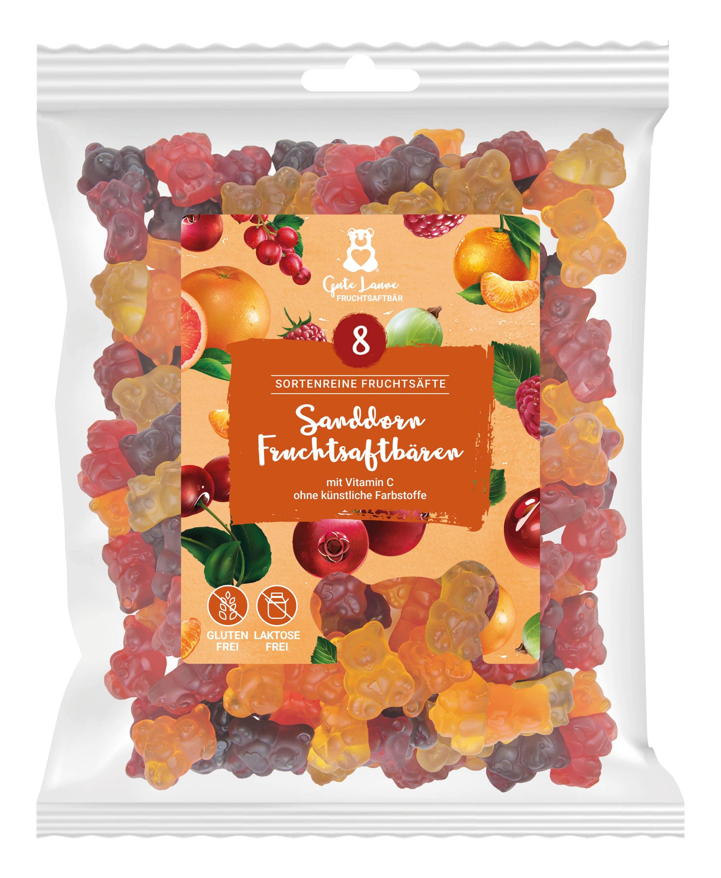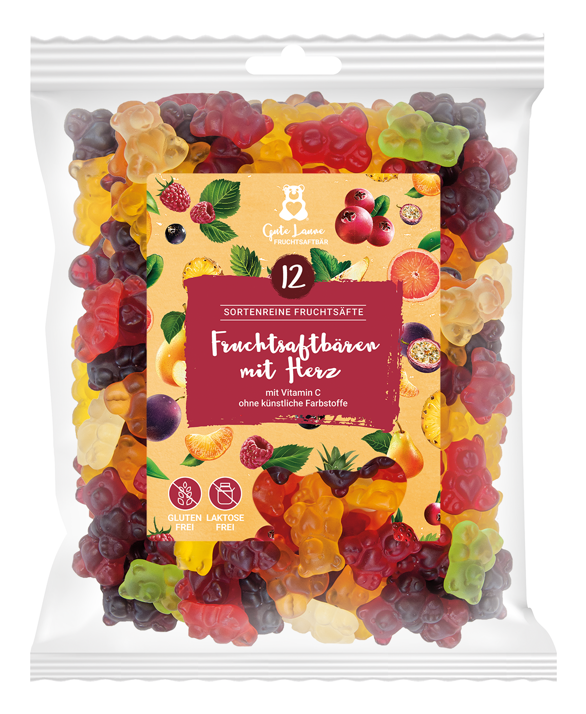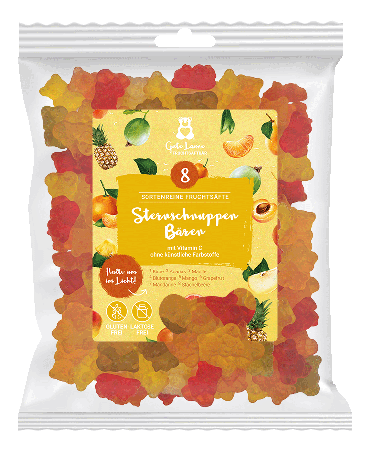 Herstellungsland: Deutschland Ernährungsweise: Getreidefrei, Glutenfrei, Milchfrei, Nussfrei und Sojafrei Haltbarkeit: 12–24 Monate Inhaltsstoffe: Glukosesirup, Zucker, 20% Fruchtsaft aus Fruchtsaftkonzentraten (Himbeere, Erdbeere, Waldfrucht, Brombeere, Pfirsich, Preiselbeere, Birne, Grapefruit, schwarze Johannisbeere, Mandarine, Ananas, Passionsfrucht), Gelatine, Säuerungsmittel (Zitronensäure, Acerolafruchtpulver, Ascorbinsäure (Vitamin C)), Aromen, Farbstoff (Konzentrate aus Karotte, Kürbis, Saflor, Apfel, Spirulina, schwarzer Karotten- und Holundersaft), Überzugsmittel (Carnaubawachs) Artikelnr.: 824