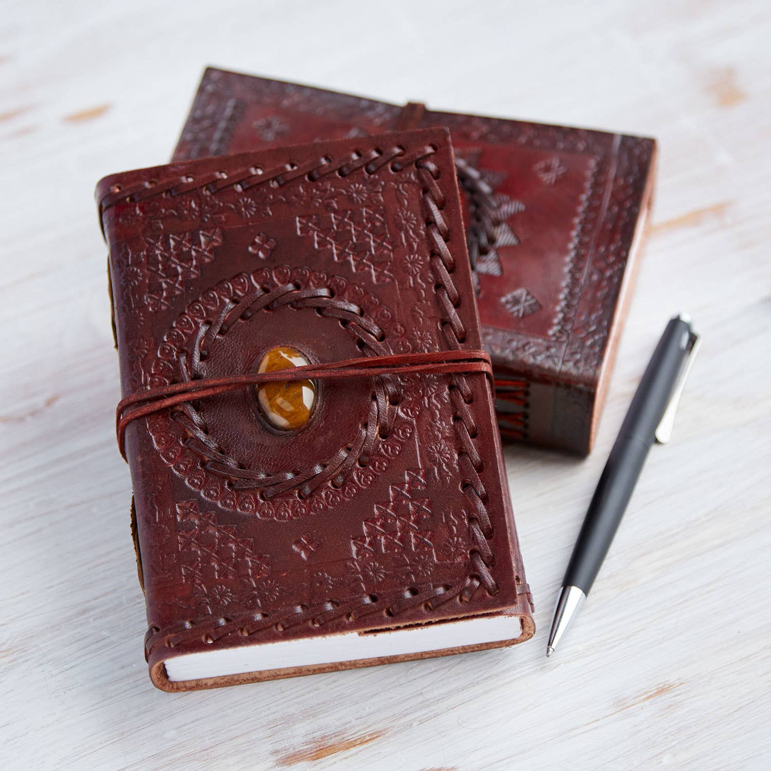 Handgefertigtes Tagebuch aus mittlerem, geprägtem Leder mit Halbedelstein im Großhandel