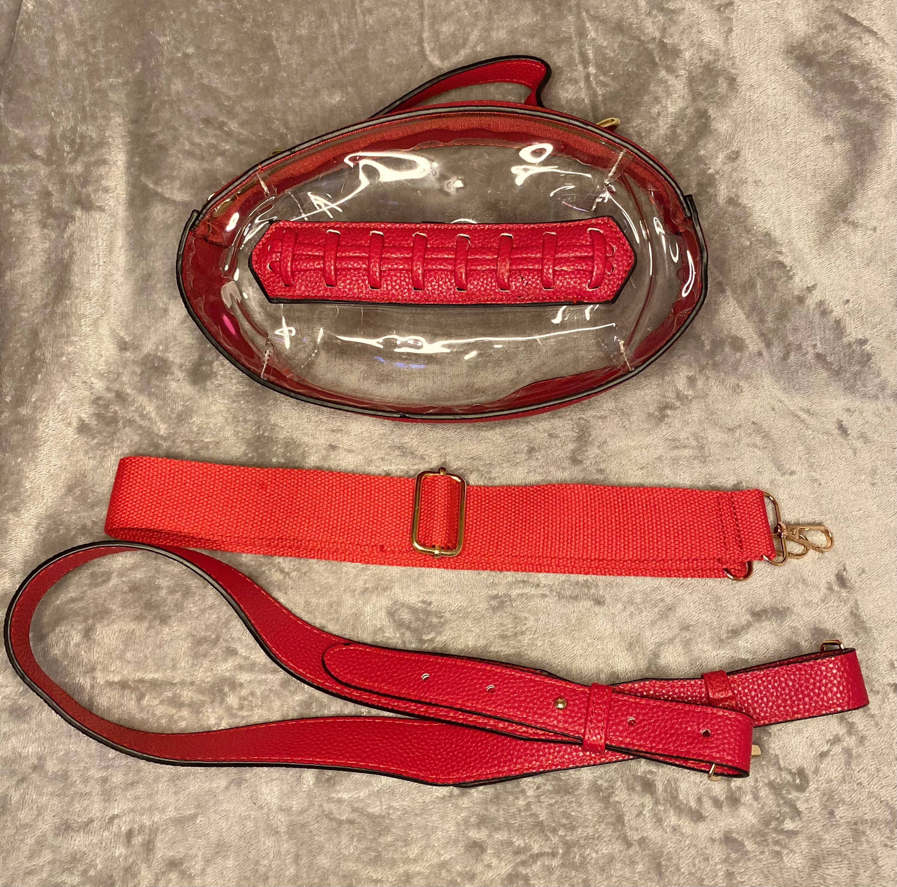 Das ist unsere wunderschöne rote durchsichtige Tasche! Diese Tasche wird mit zwei abnehmbaren Geldbörsenriemen geliefert, einem kleineren roten Riemen, der als Schultertasche verwendet werden kann, und einer goldenen Kette, um sie als Umhängetasche zu verwenden! Dieser Artikel ist absolut perfekt für Spieltage und Konzerte! Wir haben diesen Artikel auch in Schwarz, Gold, Lila und Gelb in unserer Clear Purses-Kollektion erhältlich!