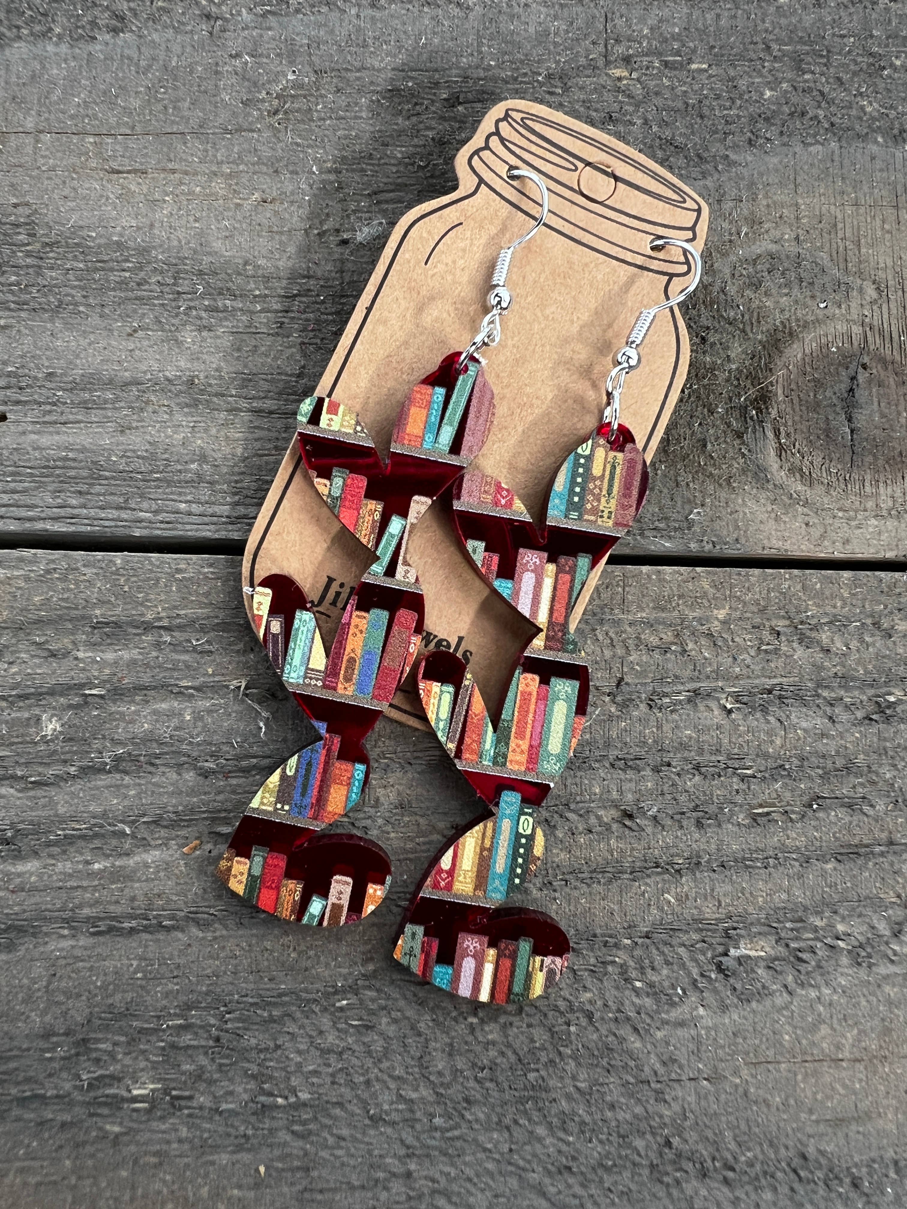 Ohrringe aus Acryl, halb Holz, mit Bücherregaldruck im Großhandel