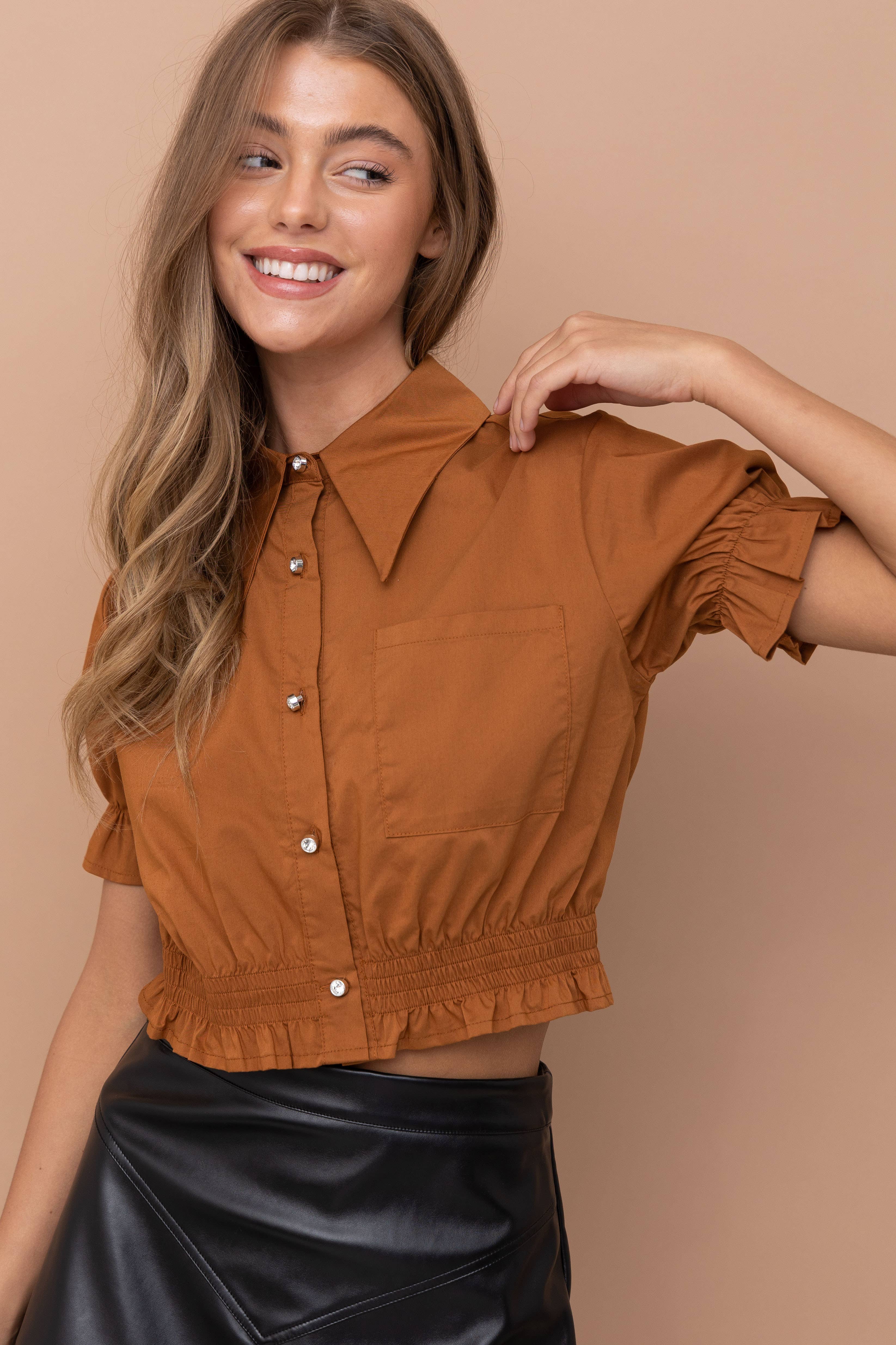 Bluse mit Rüschen vorne Knopfverschluss vorne Stretch-Popeline Das Model trägt Größe S 5'8 32-24-34