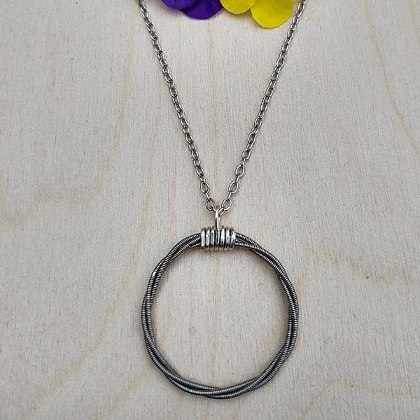 Das Herzstück dieser Halskette ist eine einzelne Gitarrensaite, die um sich selbst gewickelt ist und einen perfekten Vollmond erzeugt. Die Kette wird auf jeder Seite durch eine handgeschmiedete Drahtumwicklung befestigt. 18" in der Länge