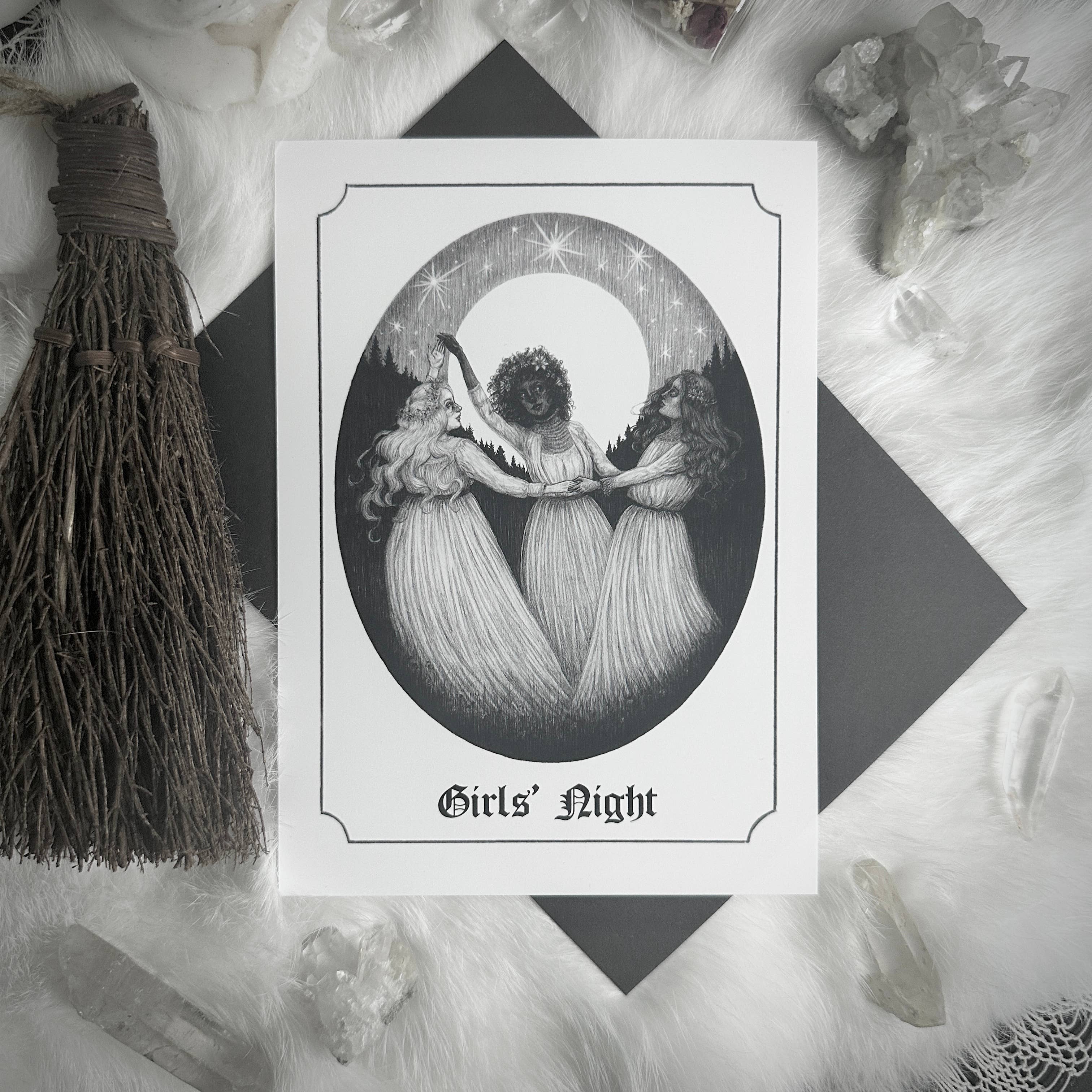 Vorderseite der Karte zeigt eine originale Illustration einer süßen kleinen viktorianischen Hexe auf einem Mond von Caitlin McCarthy. Der Text lautet: "Wünsche dir einen magischen Geburtstag" in einer gotischen Schriftart. Die Innenseite der Karte ist leer. Packung mit 10 gefalteten Grußkarten im Format 4,5x6,25”. Jede Karte ist in einer schützenden Zellophanhülle verpackt und enthält einen schwarzen Umschlag. Gedruckt auf hochwertigem mattem Karton. Empfohlener Verkaufspreis 7 $ pro Karte.