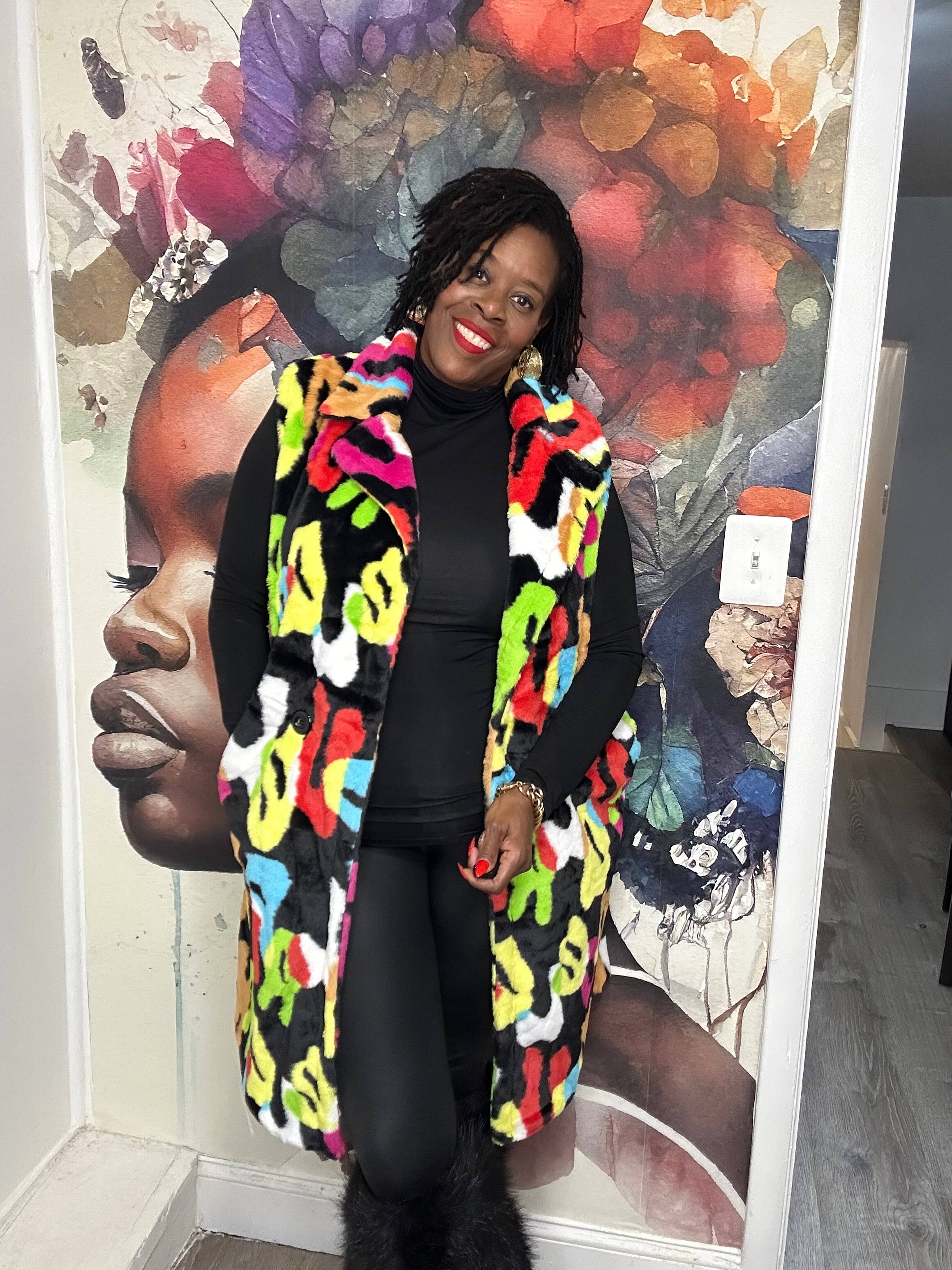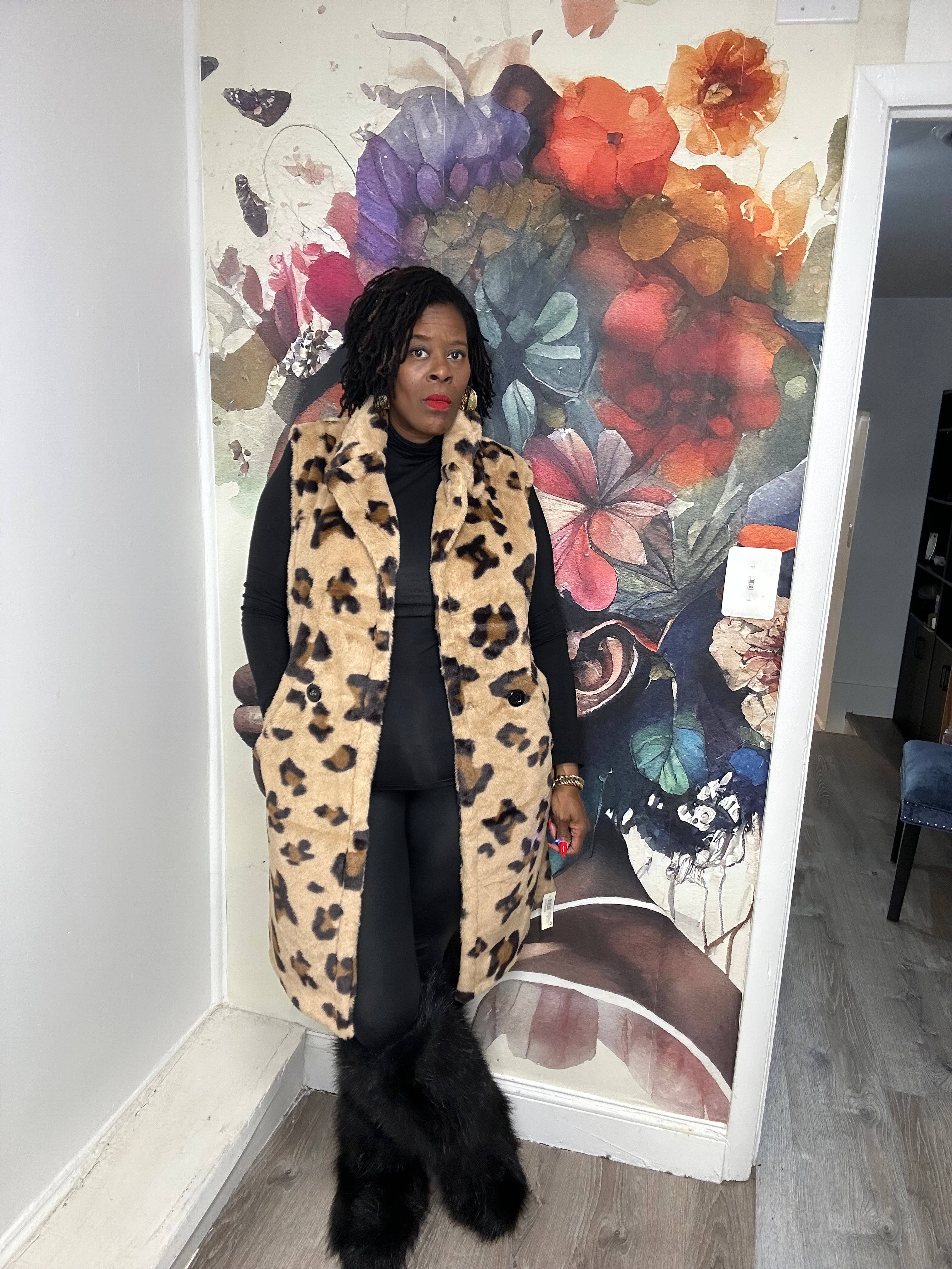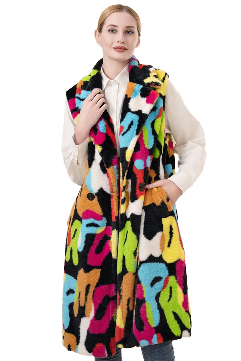 Halblange Weste mit luxuriösem Kunstziegenfell und Satinfutter. - Das Model ist 1,70 m groß und trägt Einheitsgröße. - Maße Brust-Taillen-Hüfte: 86 cm - 58 cm - 86 cm.