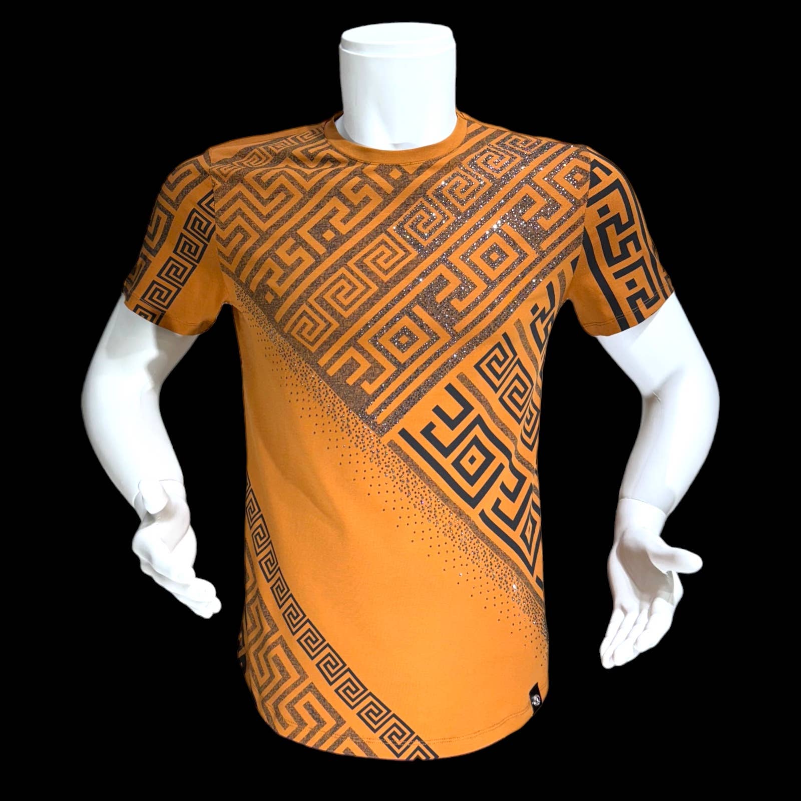 Schwarzes Herren-T-Shirt mit goldenen griechischen Stierhörnern und Strasssteinen im Großhandel