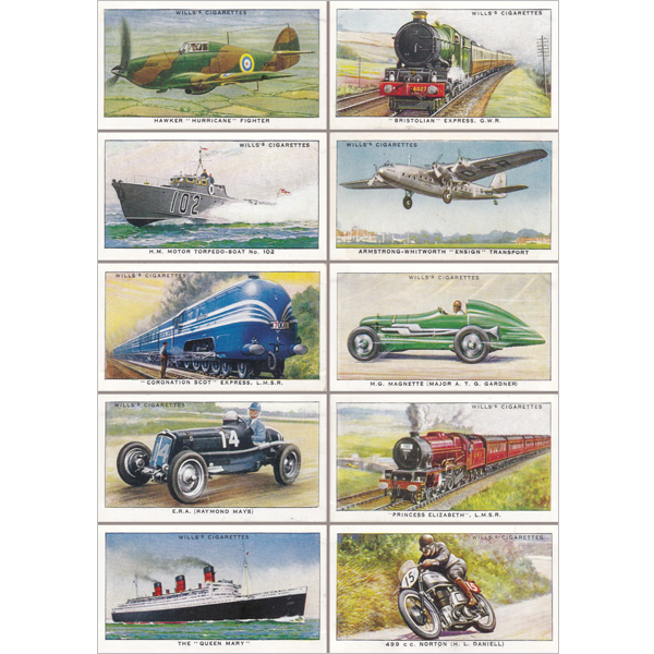 Eine Sammlung von Karten mit verschiedenen Arten von Vintage-Transportmitteln. Eine gute Karte für Männer, die Interesse an meinem Stand weckt.