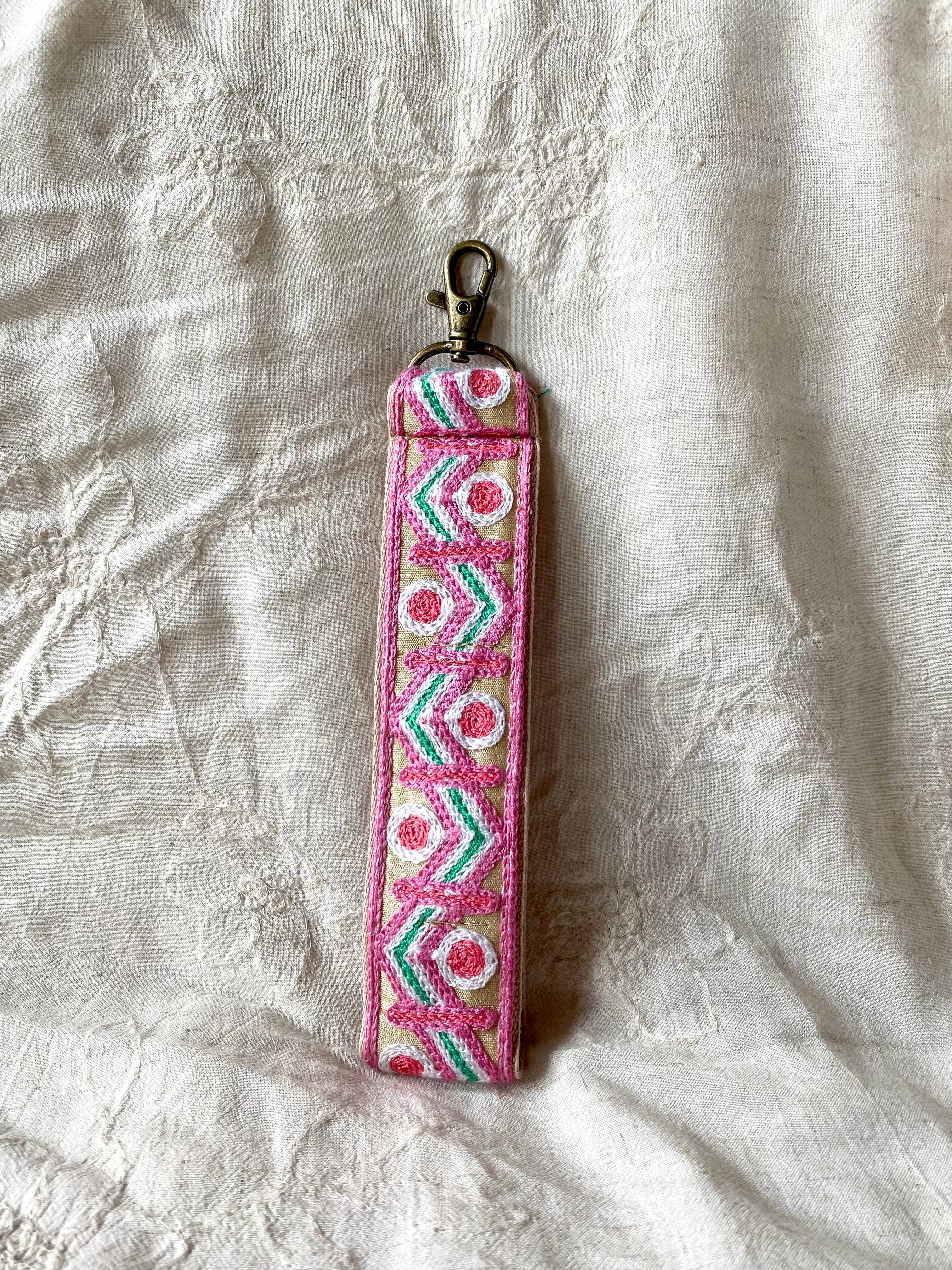 Telefonkordel, Taschenanhänger und langer Schlüsselanhänger Bei Temple of Treasure finden Sie unsere stilvollen, handgefertigten Telefonkordeln und Accessoires! Verleihen Sie Ihrem Look mit indischer Blumenstickerei ein Upgrade. Diese Telefonkordeln werden mit viel Sorgfalt in unserem Atelier in Leeuwarden, Niederlande, hergestellt. Jede Kordel zeigt lebendige Muster und Farben, die Schönheit mit moderner Funktionalität verbinden. Der elegante bronzefarbene Haken verleiht dem Accessoire eine besondere Note – so ist es nicht nur praktisch, sondern auch ein modisches Statement! Egal, ob Sie unterwegs sind, Besorgungen machen, zu einer Veranstaltung gehen oder einfach zu Hause – diese einzigartigen Telefonketten sind sowohl praktisch als auch angesagt. Anwendung: Befestigen Sie den Handgelenkriemen an Ihrem Telefonpad (ebenfalls in unserem Shop erhältlich) und schieben Sie das PVC-Pad zwischen Telefon und Hülle – fertig! *Taschenanhänger oder Schlüsselanhänger: Diese Kordel ist nicht nur für Handys geeignet, sondern kann auch als stylischer Taschenanhänger einen Farbakzent an Ihrer Tasche setzen.