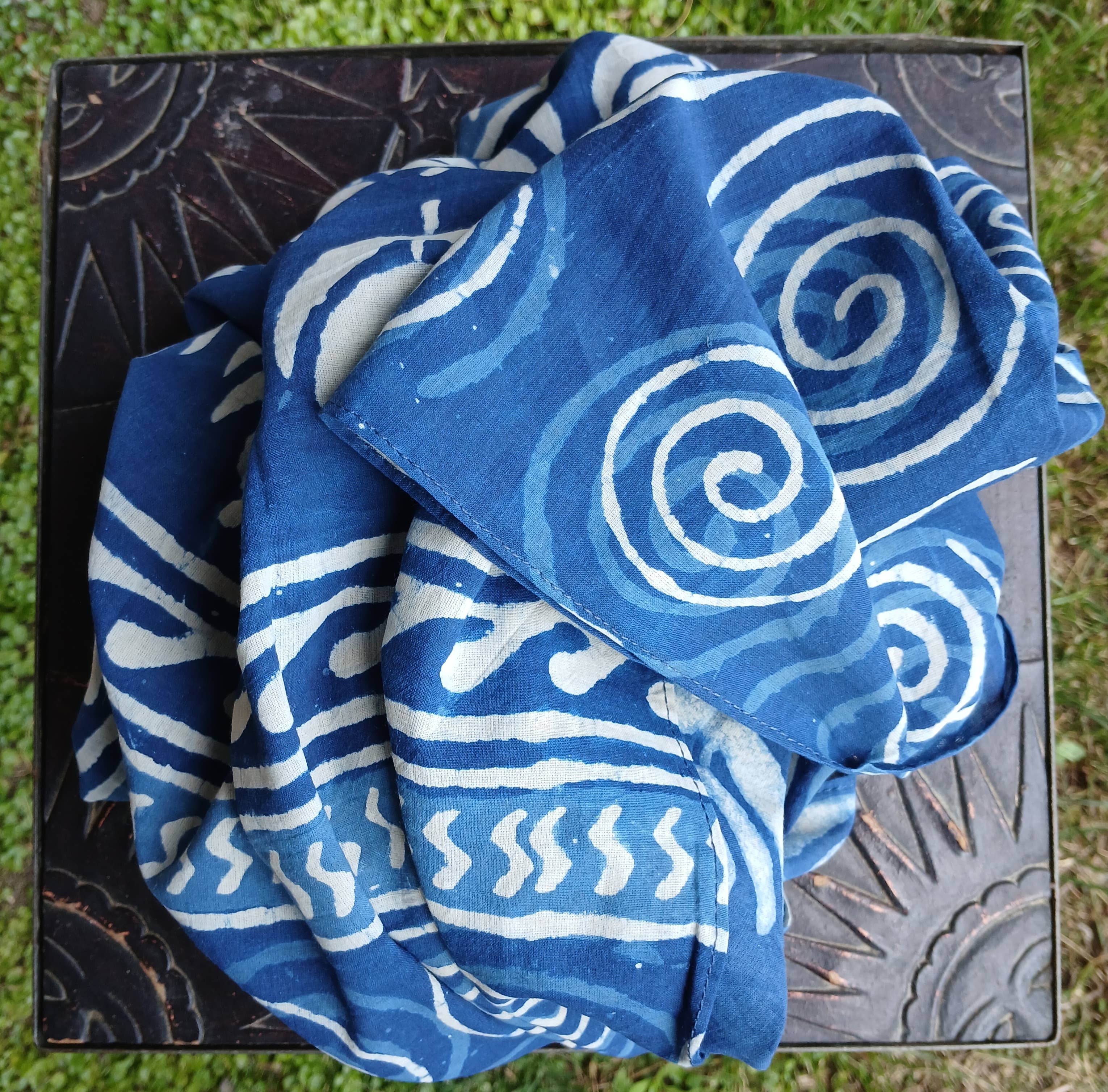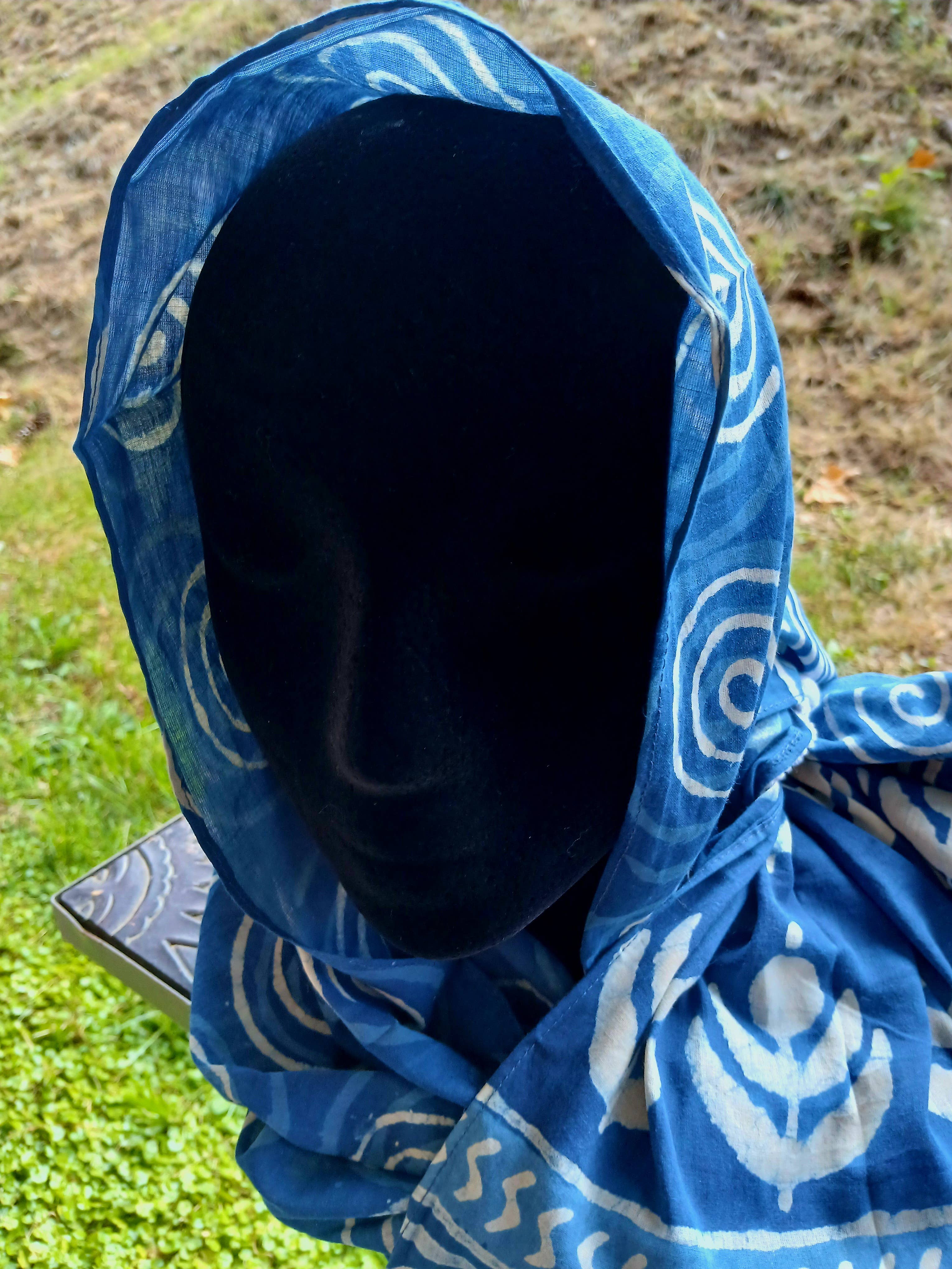 Baumwollschal mit Blockdruck - Indigoblau mit Spiralen und Blumen