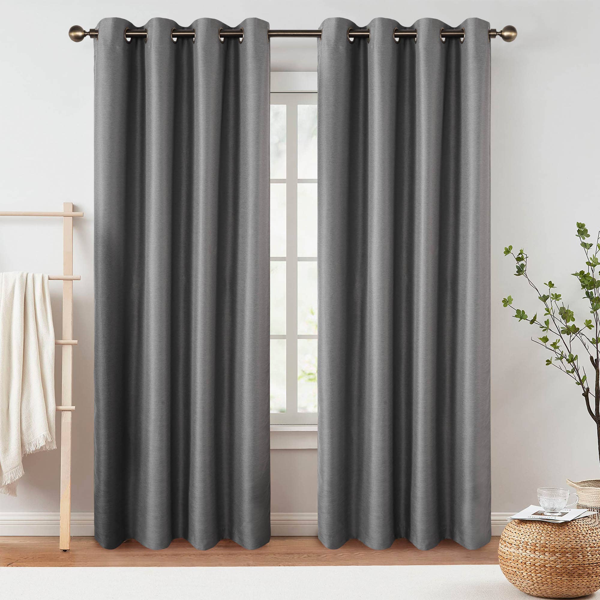 Wir präsentieren unser exquisites Verdunkelungsvorhang-Set mit Ösen, das entwickelt wurde, um Ihrer Inneneinrichtung Eleganz und Funktionalität zu verleihen. Obwohl aus Polyester gefertigt, imitiert der Stoff das luxuriöse Aussehen von zweifarbigem Leinen und bietet die perfekte Mischung aus Stil und Praktikabilität. Mit einem energiesparenden Verdunkelungsfutter sind diese Vorhänge ideal für Schlafzimmer, Kinderzimmer oder jeden Raum, in dem Sie Lärmminderung, Privatsphäre und Dunkelheit benötigen. Genießen Sie erholsamen Schlaf und Entspannung ohne unerwünschtes Licht. Die ölgeriebenen Bronzeösen verleihen Wärme und Eleganz und ergänzen verschiedene Einrichtungsstile, von modern über traditionell bis hin zu eklektisch.